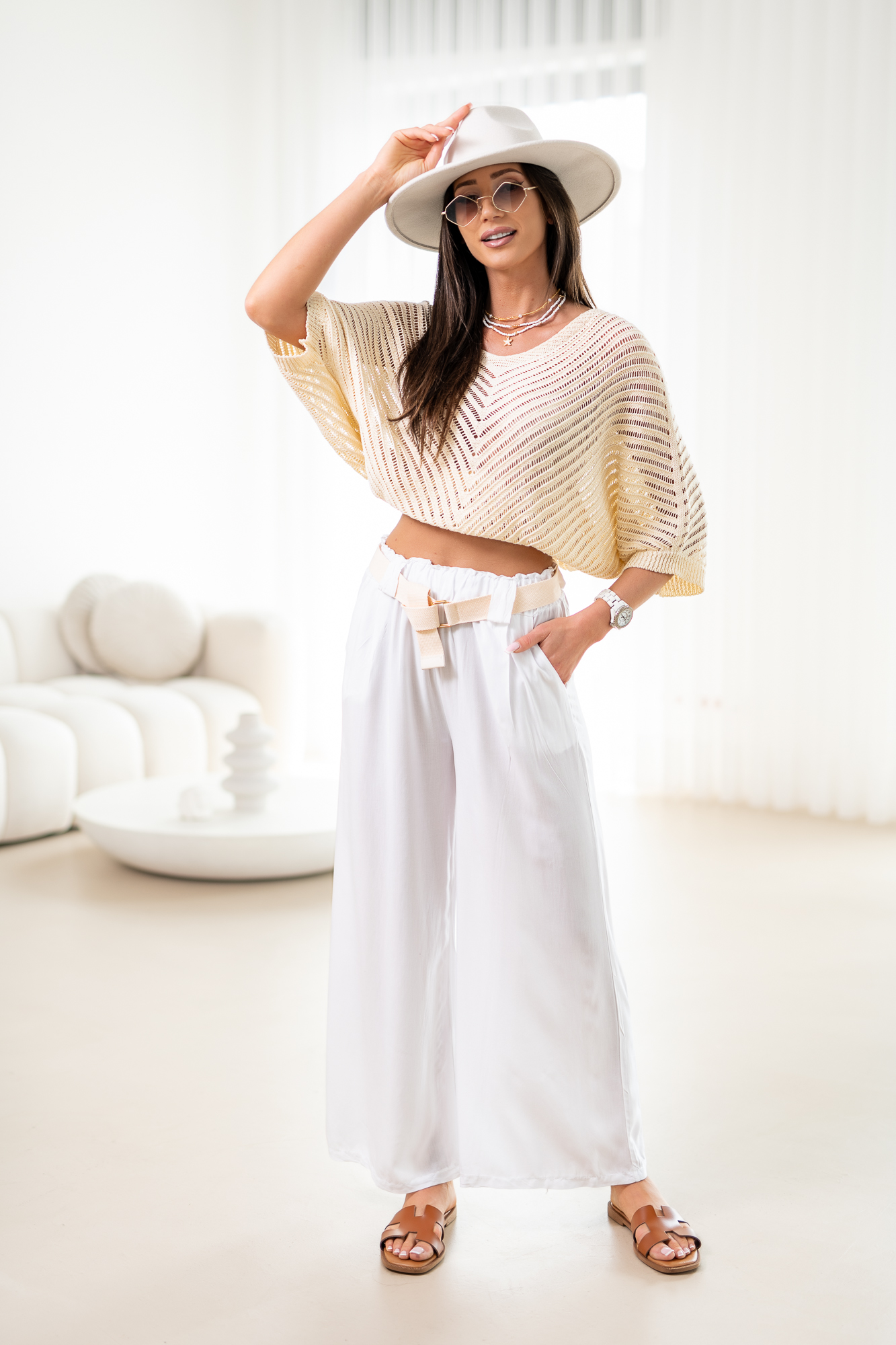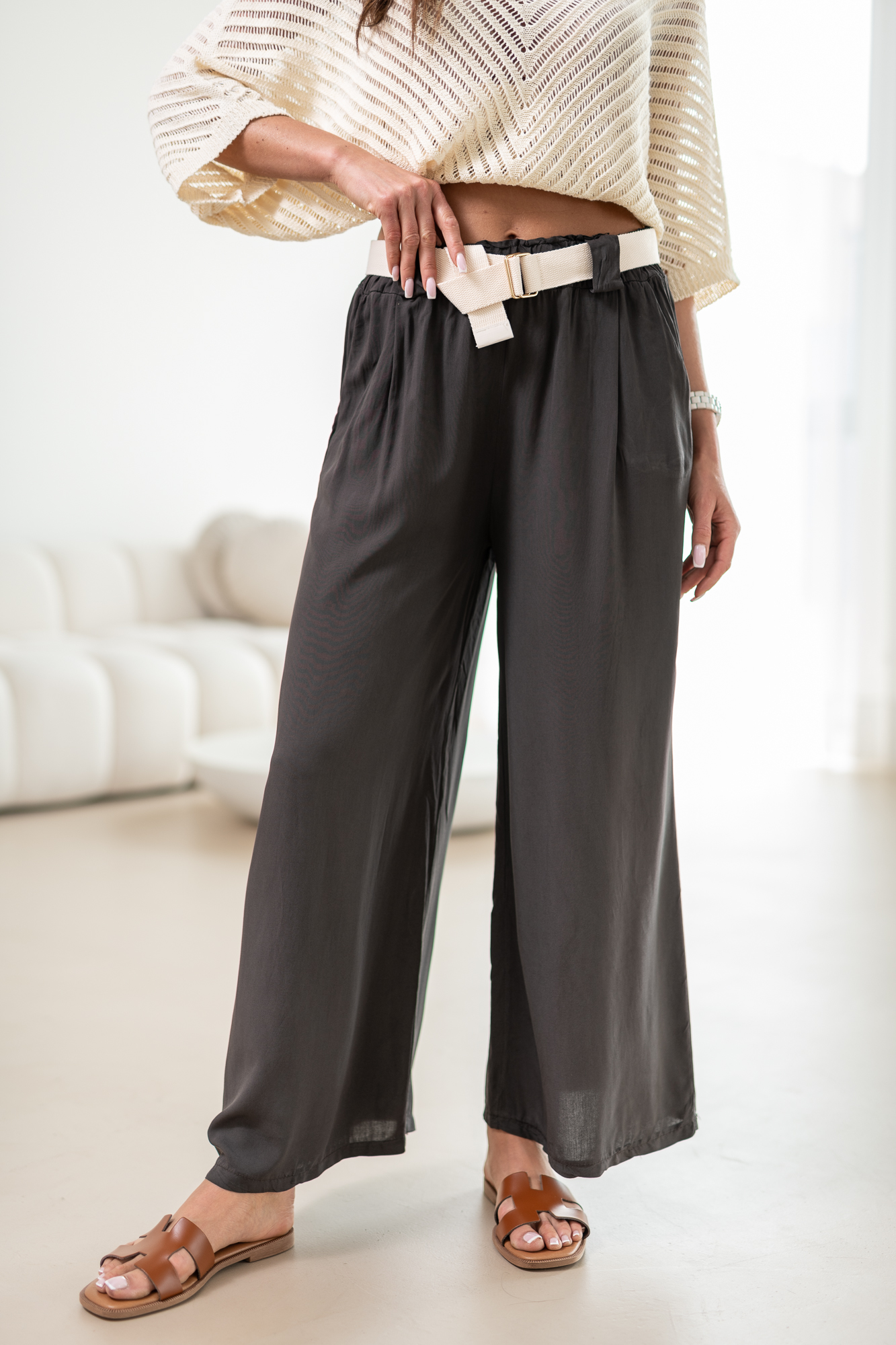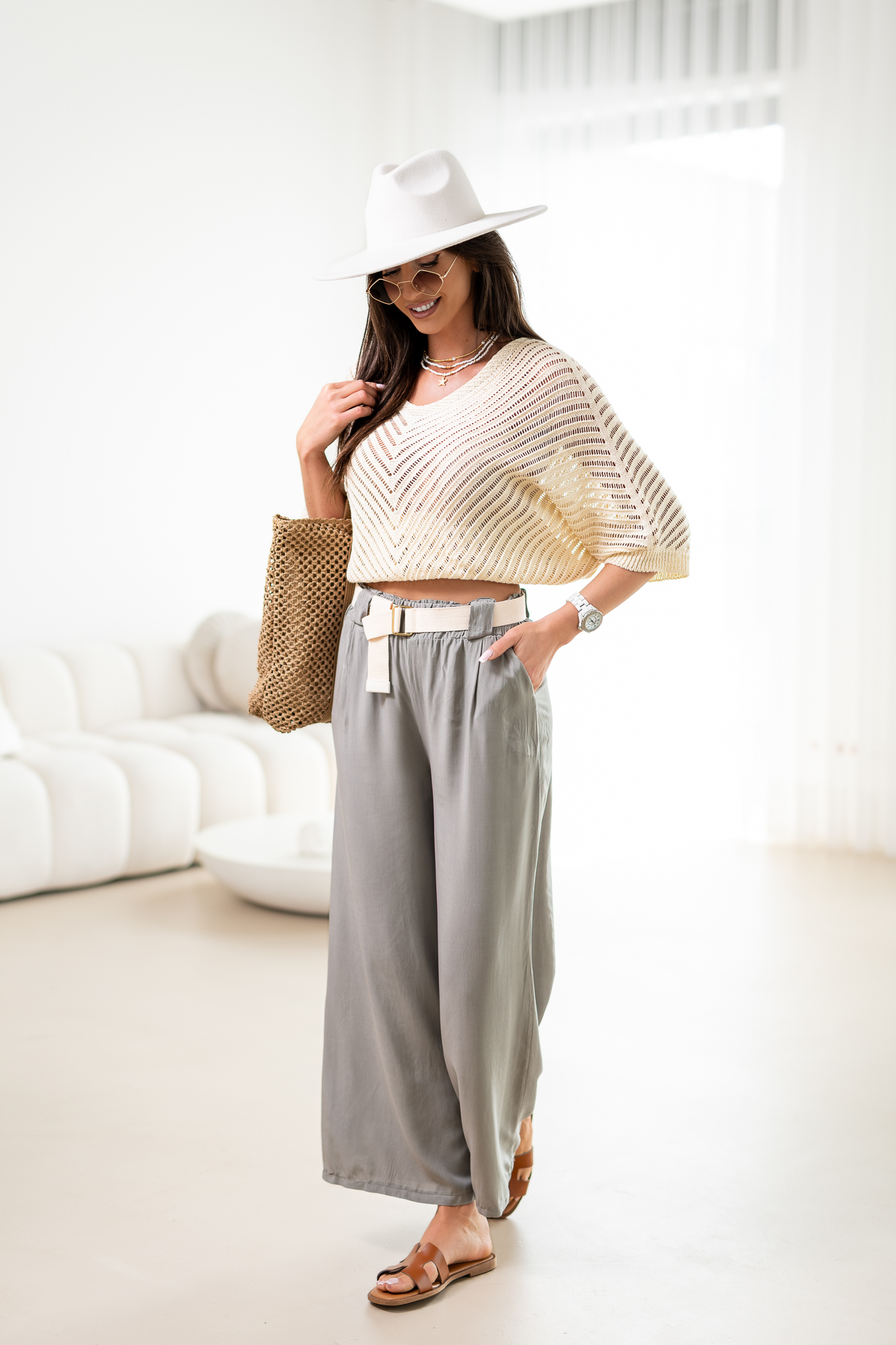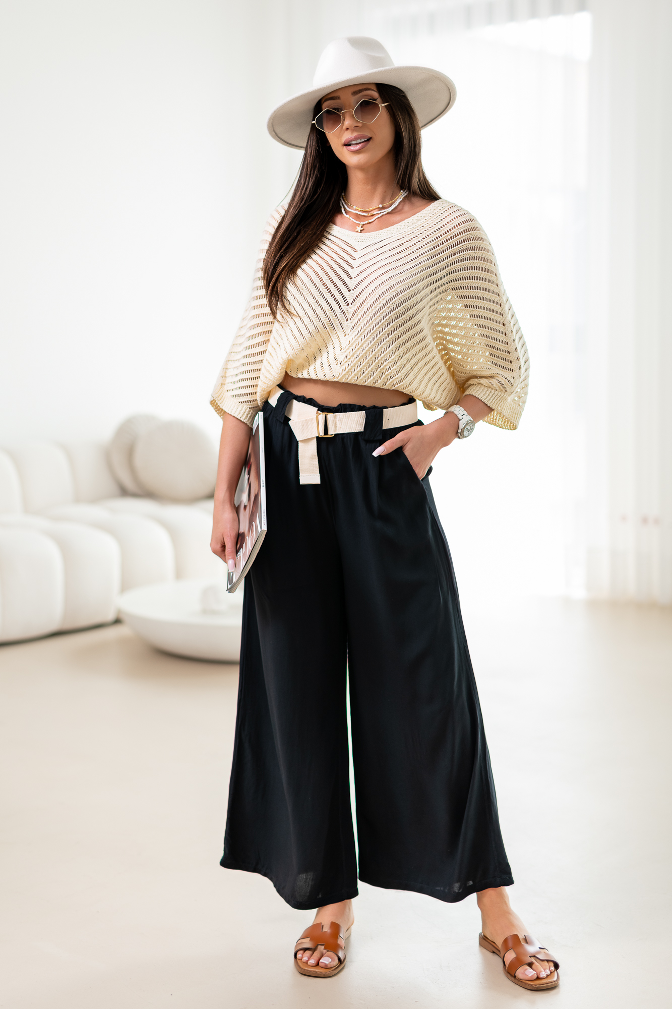 Nasze spodnie Ewelain w żadnym wypadku nie są zwyczajne. Producenci tych spodni piszą o nich tak „Przestudiowaliśmy DNA najbardziej uniwersalnej klasyki, a następnie nadaliśmy jej super aktualny charakter – i tak powstały te sięgające do kostki spodnie z szeroką nogawką”. Mega miły materiał, przewiewny i cudownie układający się na sylwetce. Spodnie sprzedawane są w komplecie z paskiem.