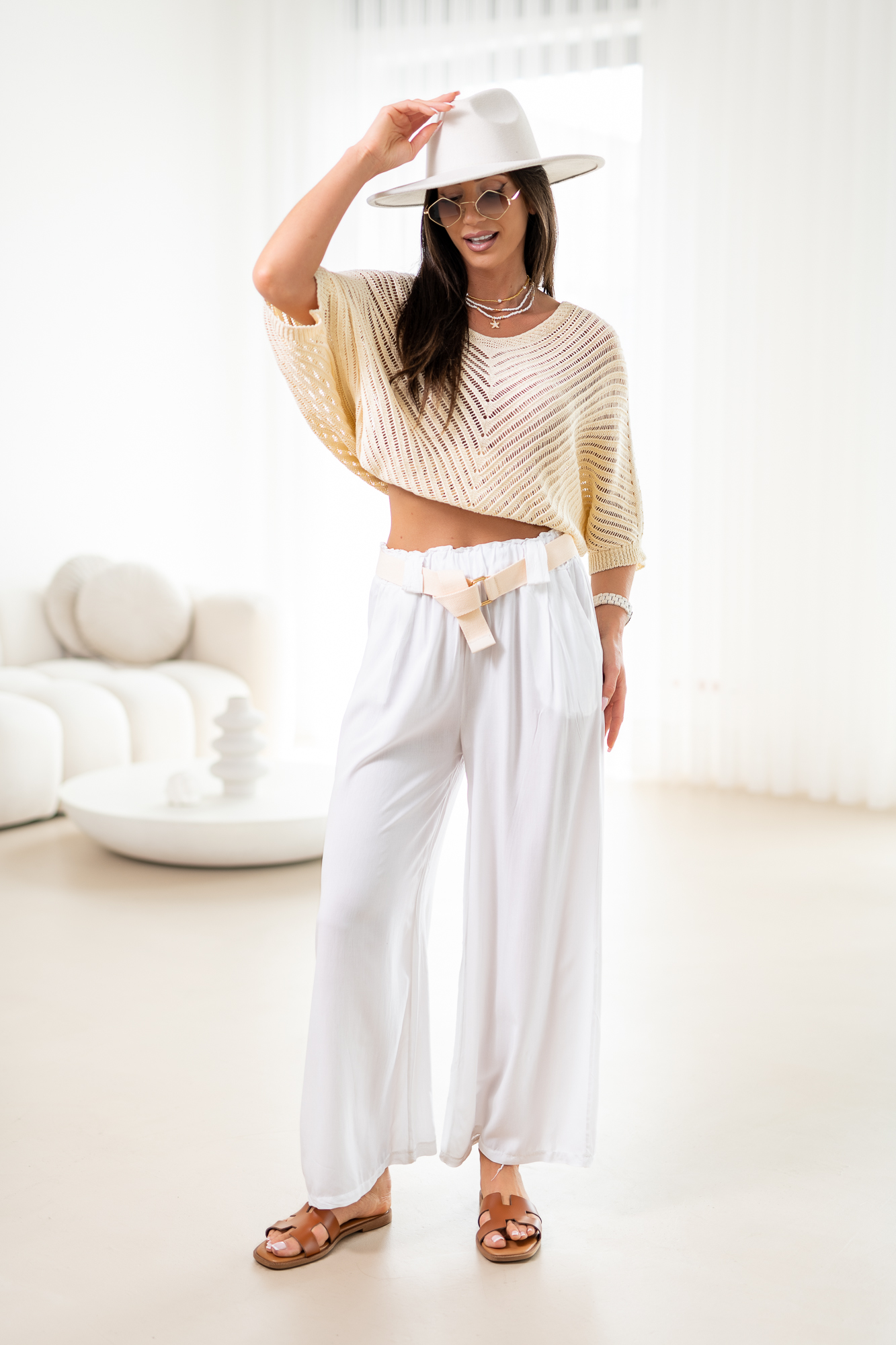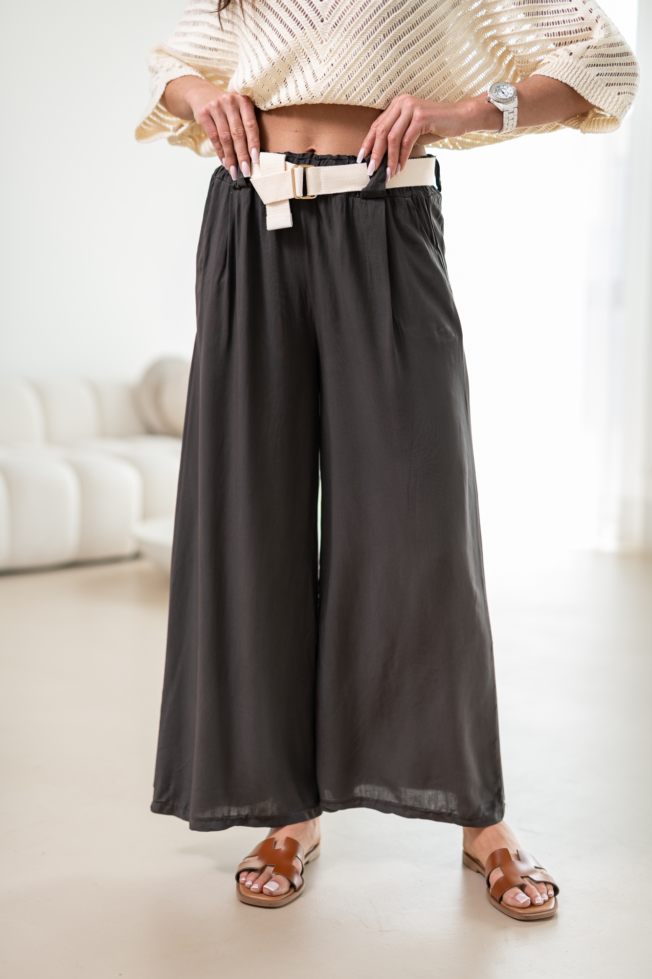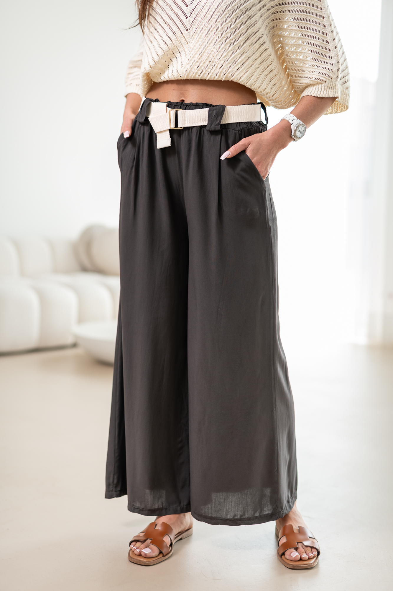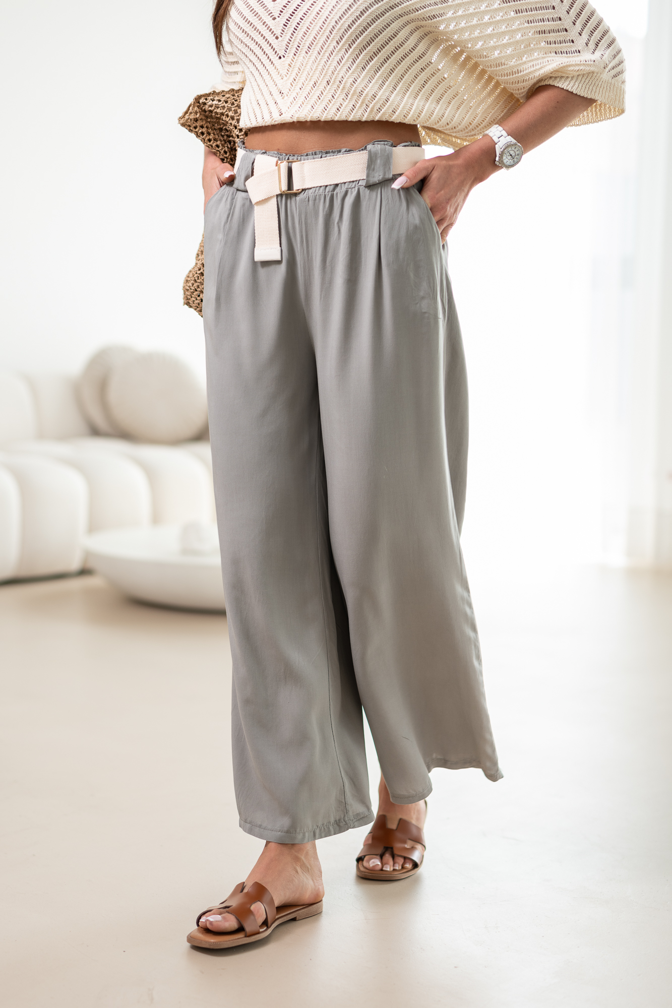 Nasze spodnie Ewelain w żadnym wypadku nie są zwyczajne. Producenci tych spodni piszą o nich tak „Przestudiowaliśmy DNA najbardziej uniwersalnej klasyki, a następnie nadaliśmy jej super aktualny charakter – i tak powstały te sięgające do kostki spodnie z szeroką nogawką”. Mega miły materiał, przewiewny i cudownie układający się na sylwetce. Spodnie sprzedawane są w komplecie z paskiem.