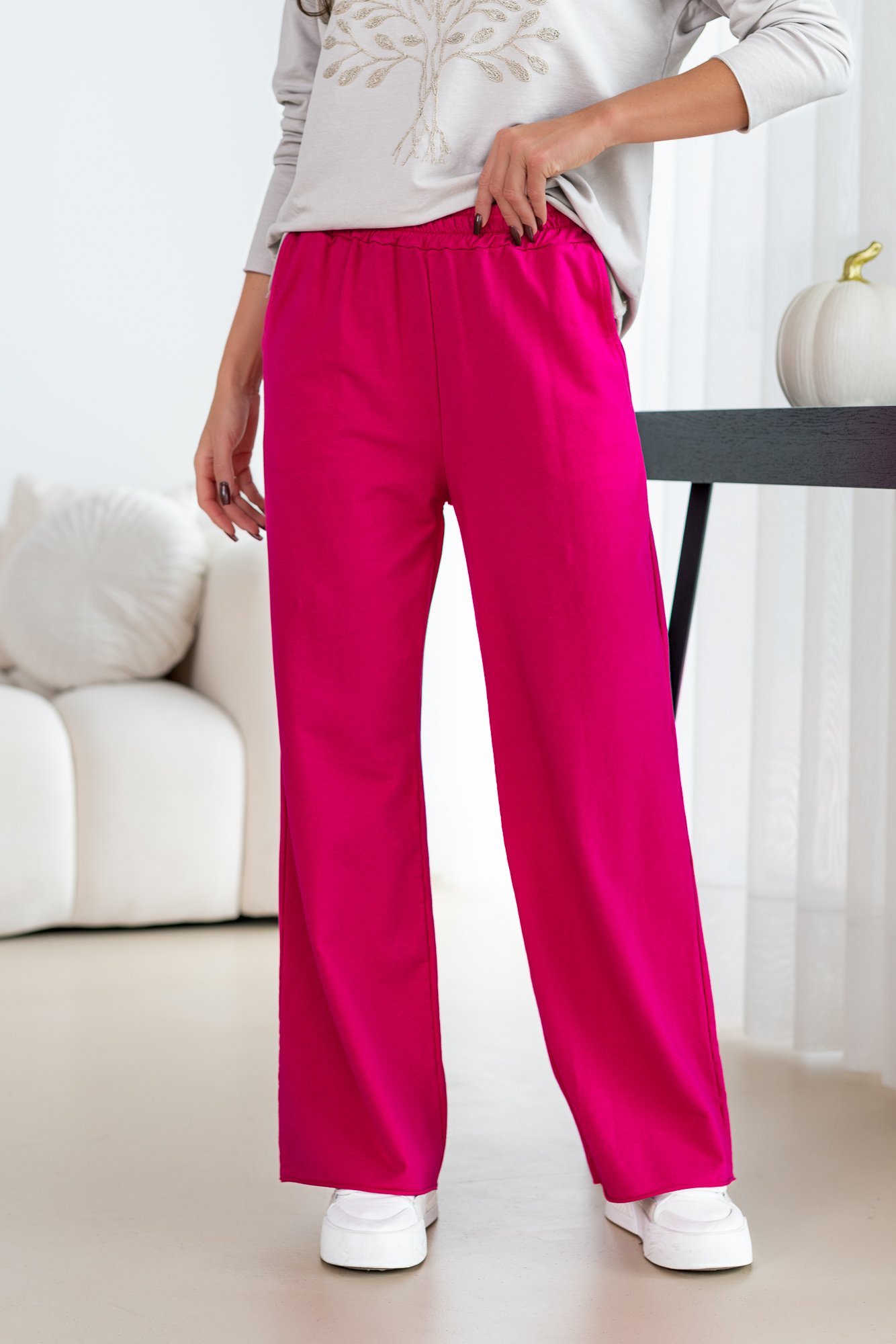 Komplet wykonany z wysokiej jakości bawełnianego materiału to propozycja, która doskonale sprawdzi się w każdej garderobie. Bluzka o oversizowym kroju wyróżnia się delikatnie dłuższym, asymetrycznym tyłem. Posiada zaokrąglony dekolt i długie rękawy. Spodnie to model z modnymi, szerokimi nogawkami i kieszeniami. W ich pasie znajduje się elastyczna gumka, dzięki której idealnie dopasowują się do sylwetki. Całość prezentuje się naprawdę efektownie i pozwala na stworzenie wygodnej, a jednocześnie oryginalnej stylizacji!