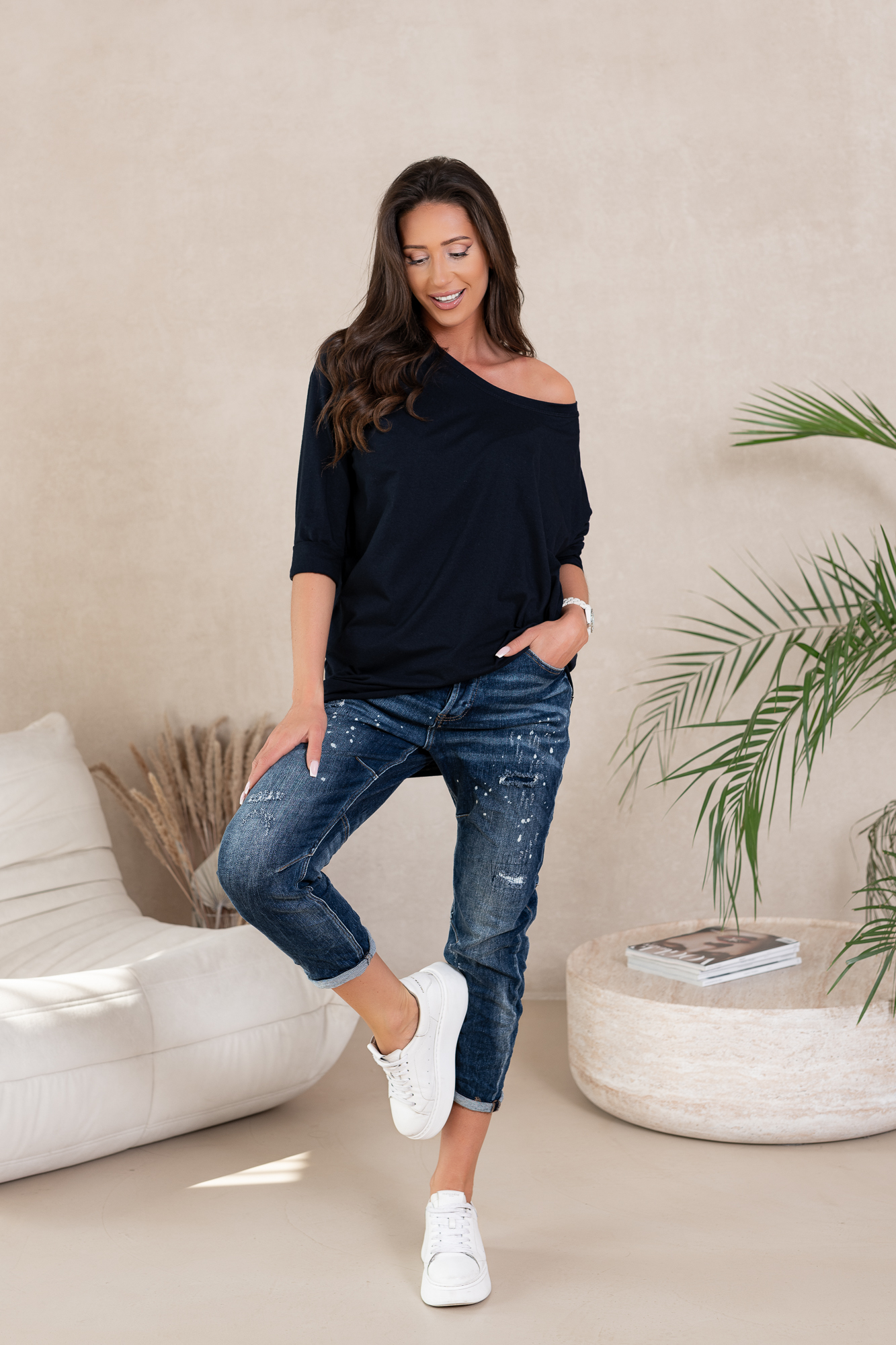 Niepowtarzalne jeansy, które łączą w sobie nowoczesny styl i ponadczasowy komfort. Wykonane z wytrzymałego materiału, zapewniają nie tylko trwałość, ale również swobodę ruchu przez cały dzień. Ich głęboki niebieski kolor z unikalnym efektem postarzania wprowadza nutę oryginalności i charakteru do każdej stylizacji. Idealnie dopasowują się do sylwetki, podkreślając jej atuty i dodając pewności siebie. To doskonały wybór dla osób ceniących sobie modny wygląd i niebanalny design w codziennym ubiorze.
