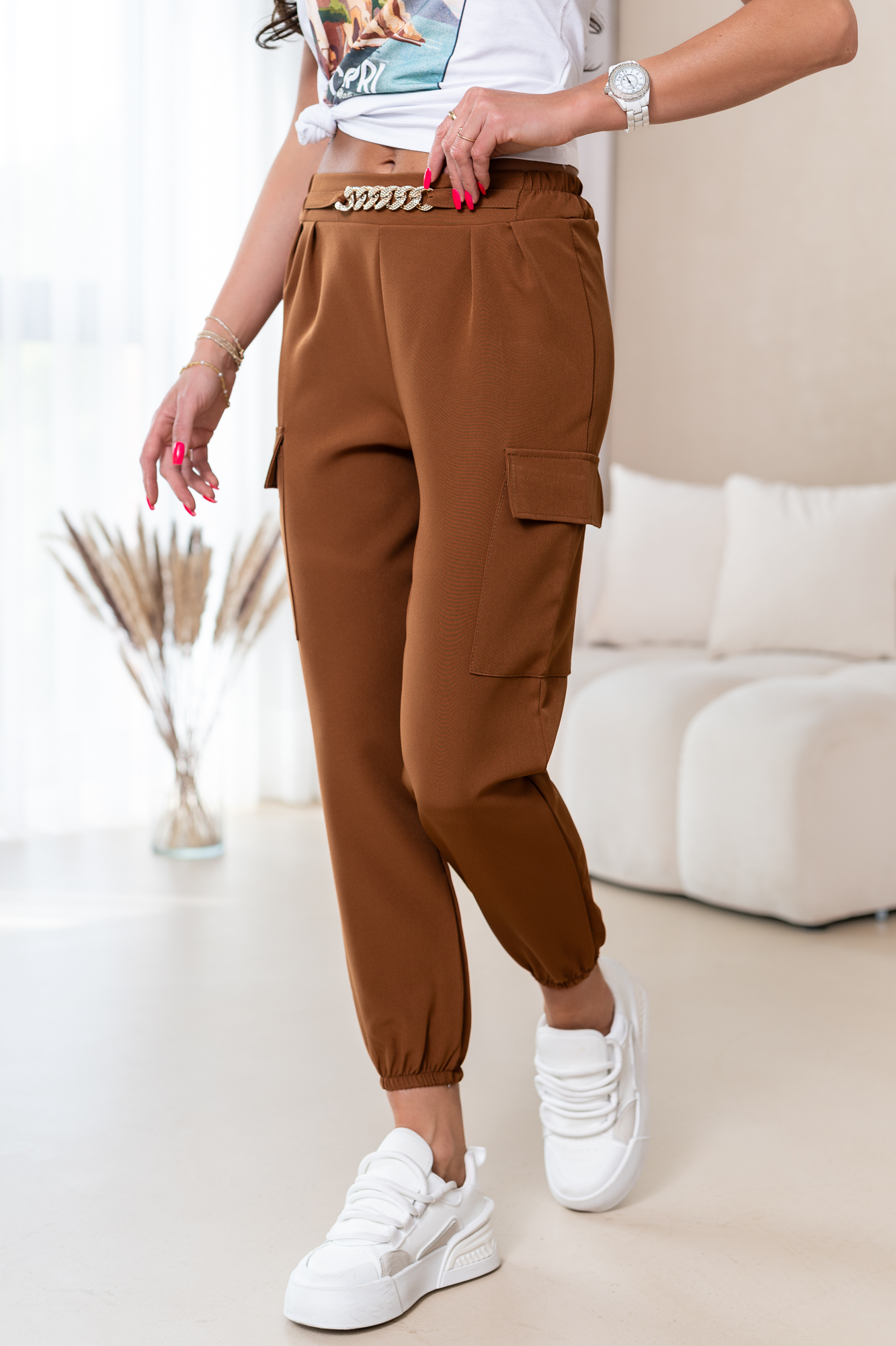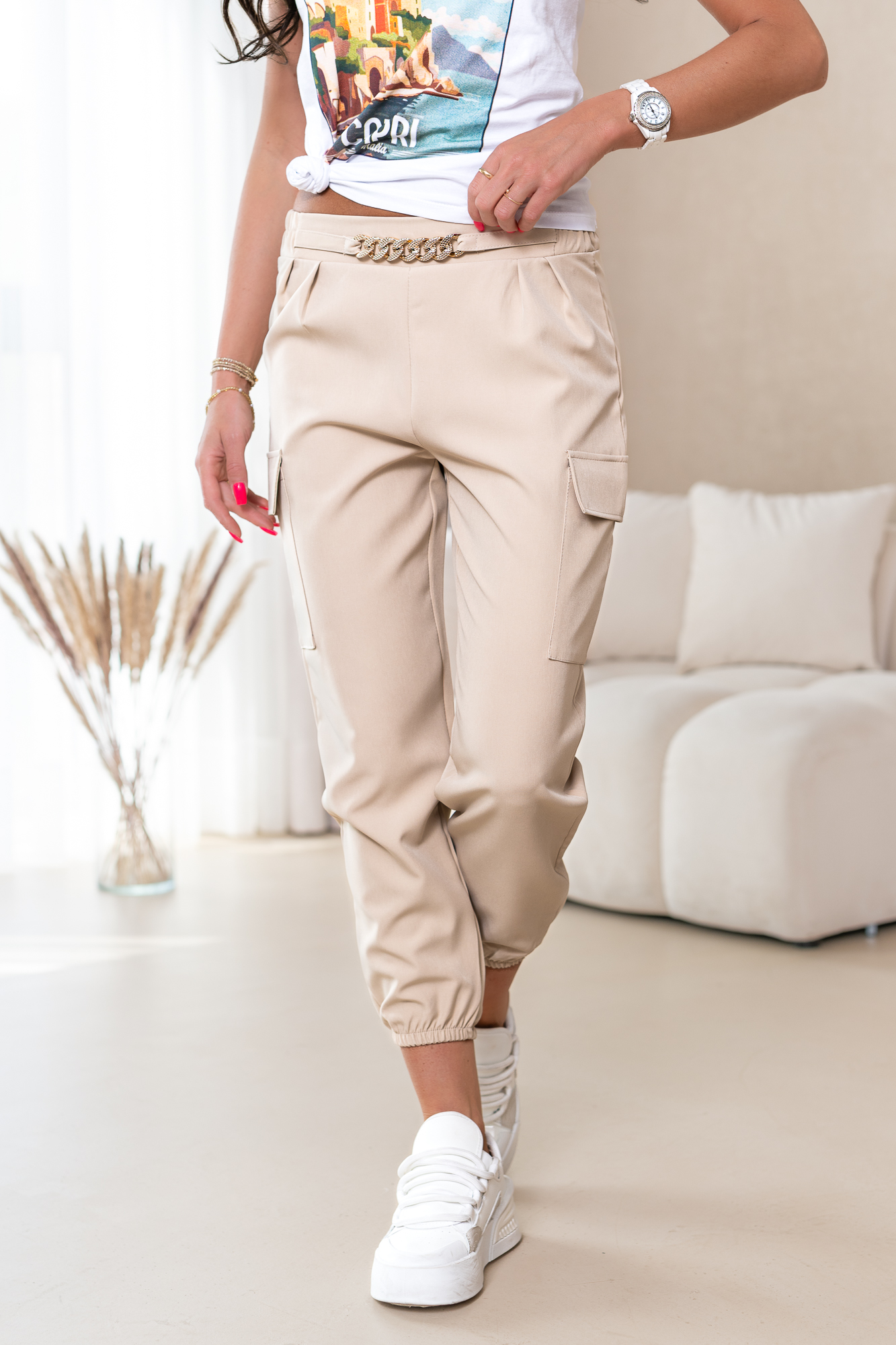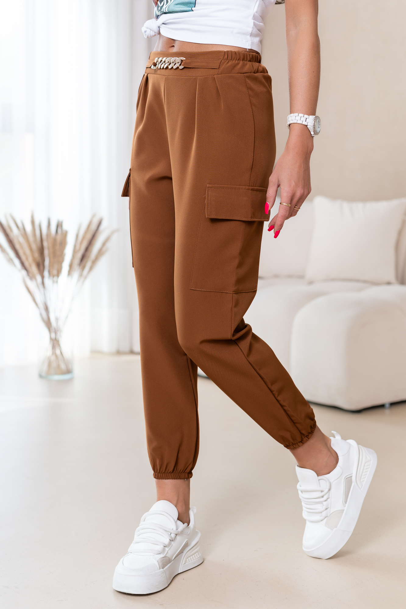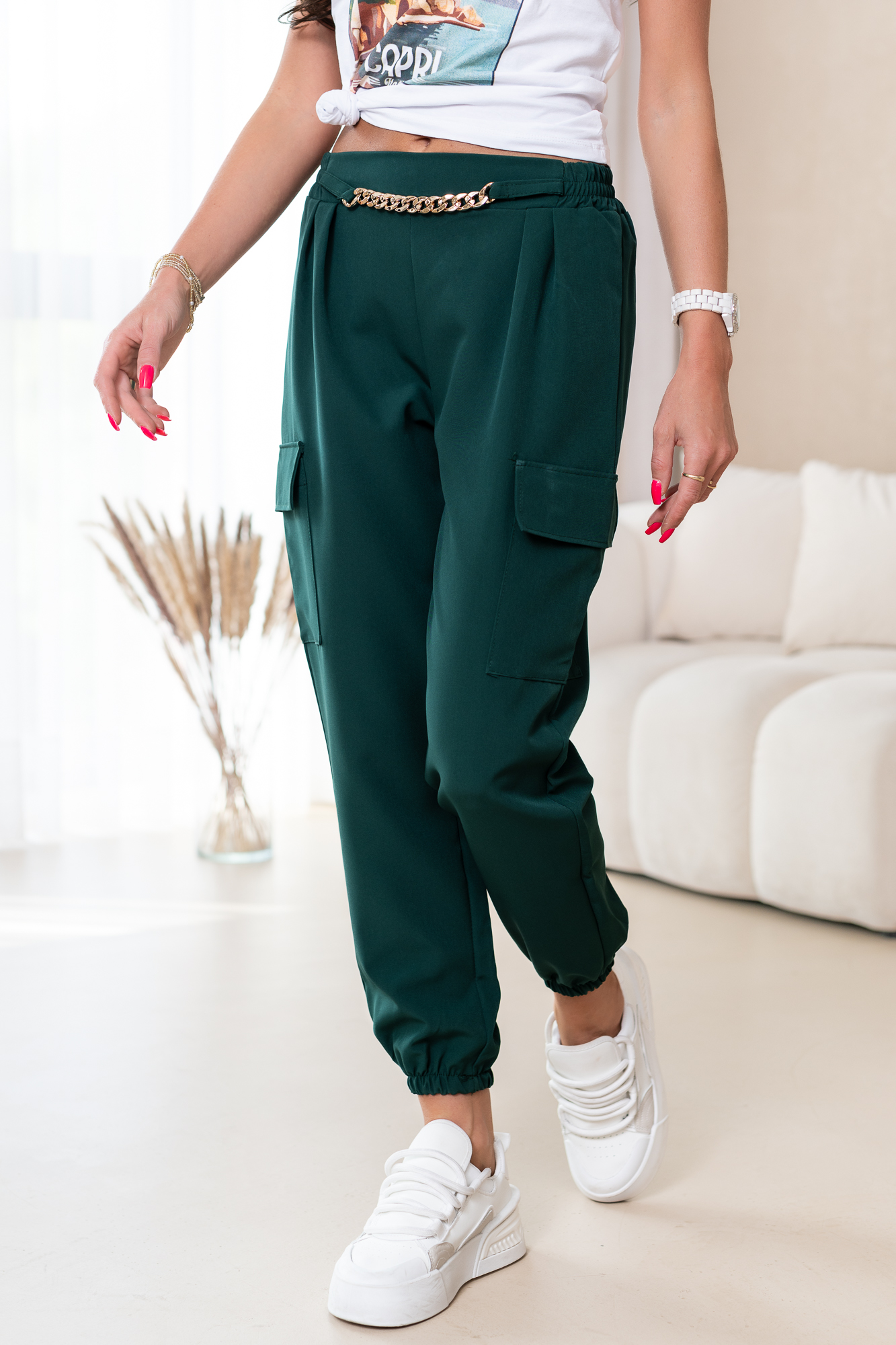 Spodnie typu bojówki. Zaprojektowane są tak, byś wyglądała w nich naprawdę atrakcyjnie. Jest to modele idealny do sportowych i casualowych stylizacji. Włożysz je na spacer i na wyjścia ze znajomymi.
