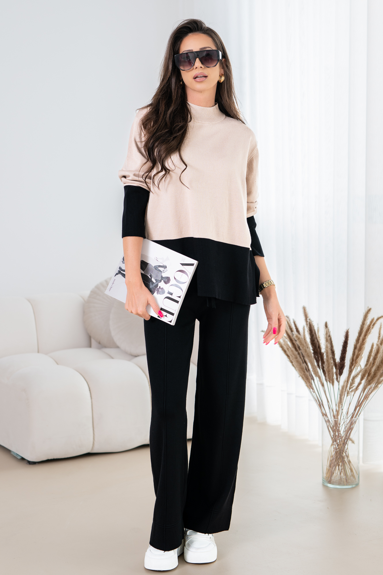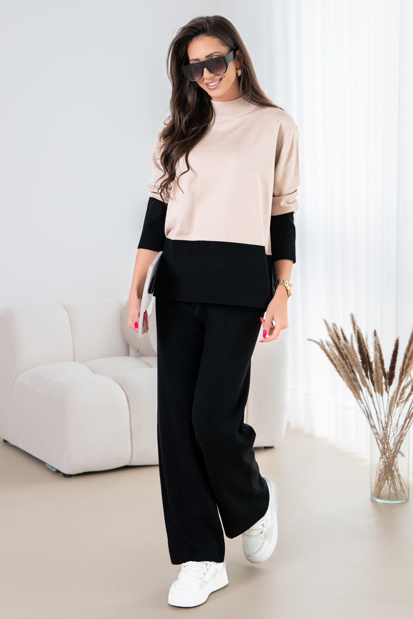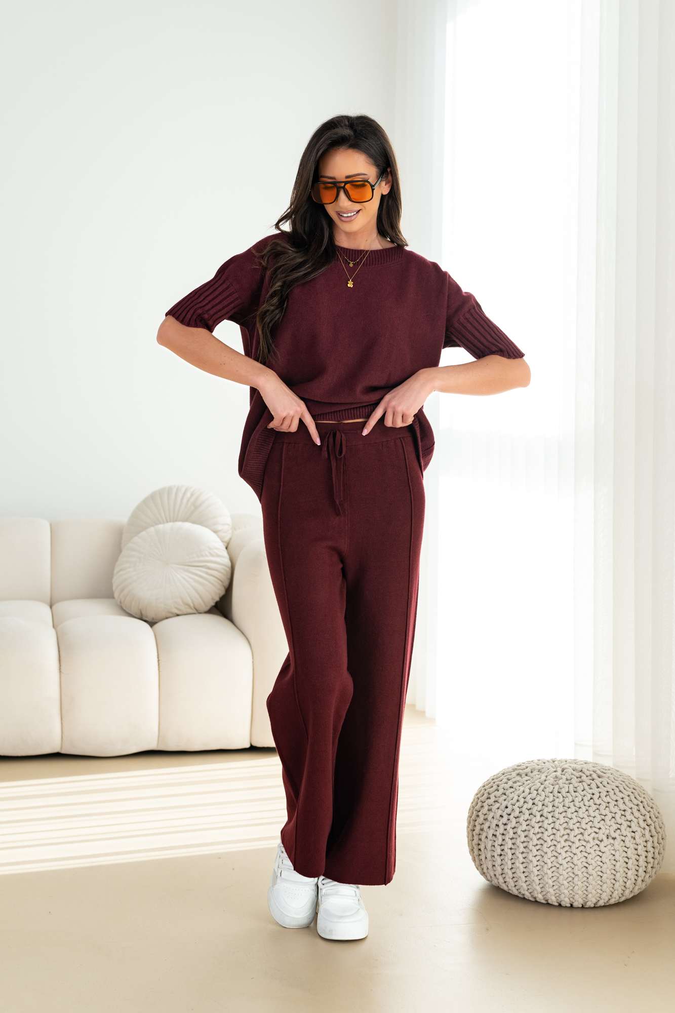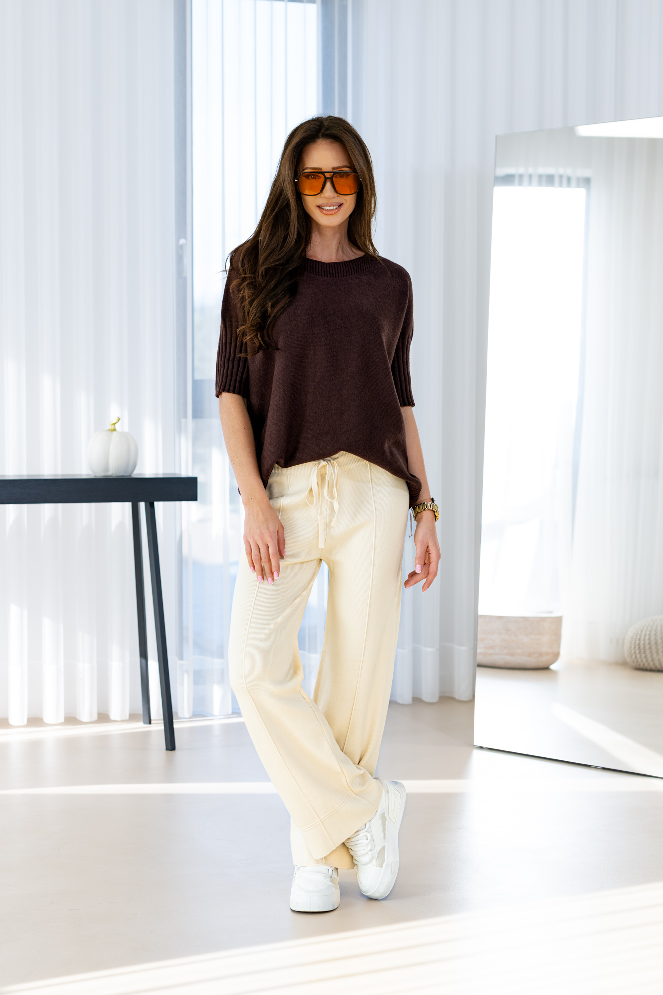Spodnie z bardzo przyjemnej dzianiny na szerokiej gumie. Modny i wygodny styl na codzienne i niecodzienne wyjścia oraz spotkania.