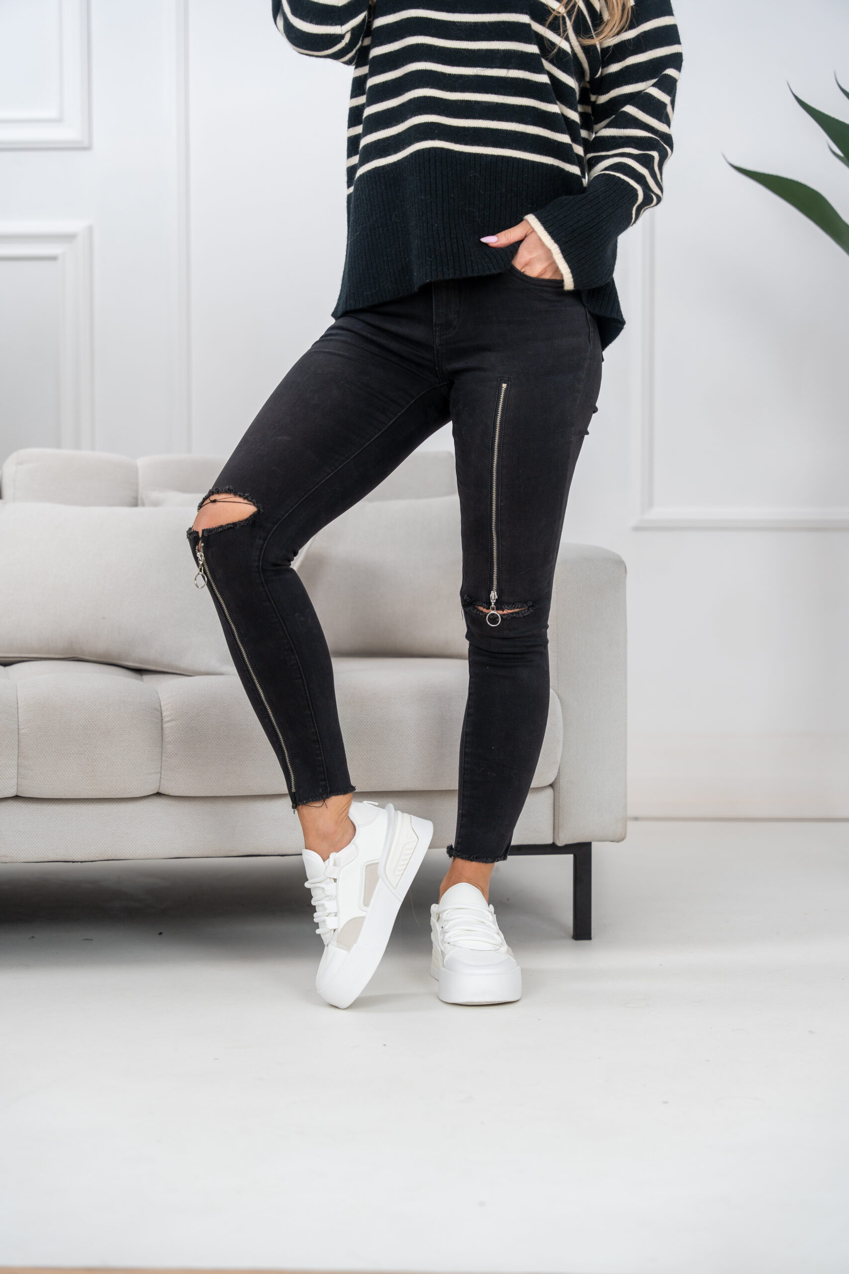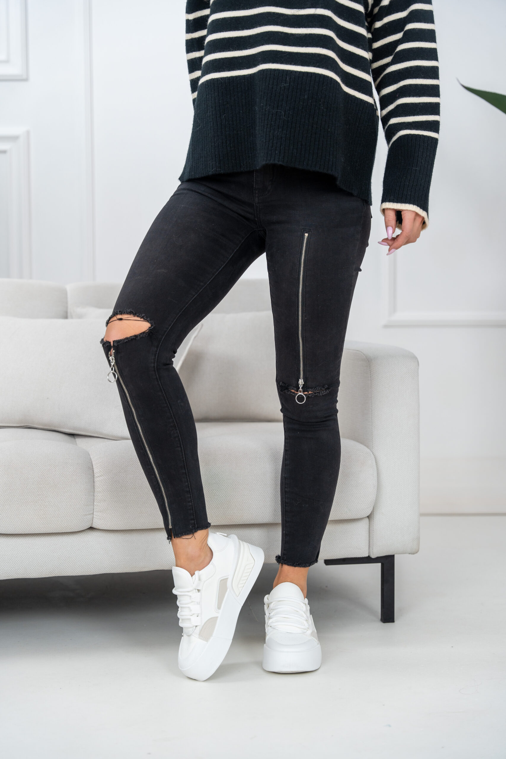 Spodnie jeansowe ze średnim stanem zapinane na suwak i jeden guzik. Ciekawy design i bardzo kobiecy krój. Podkreślają sylwetkę.