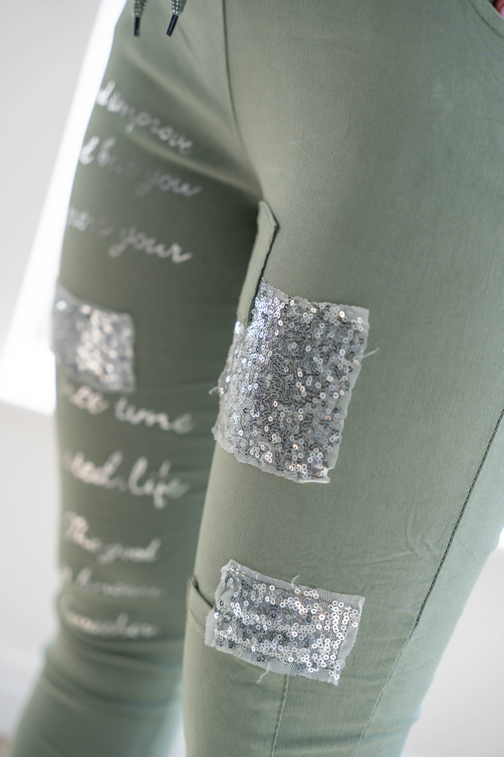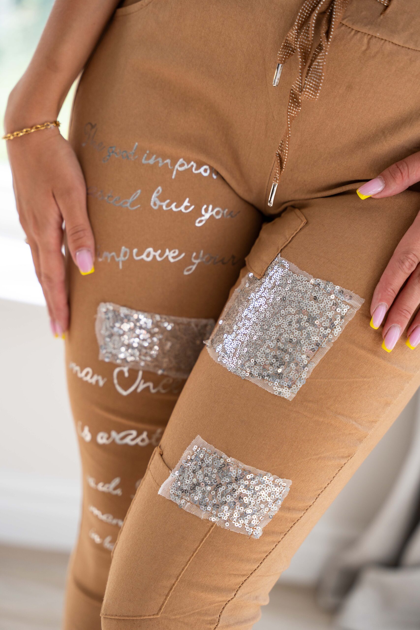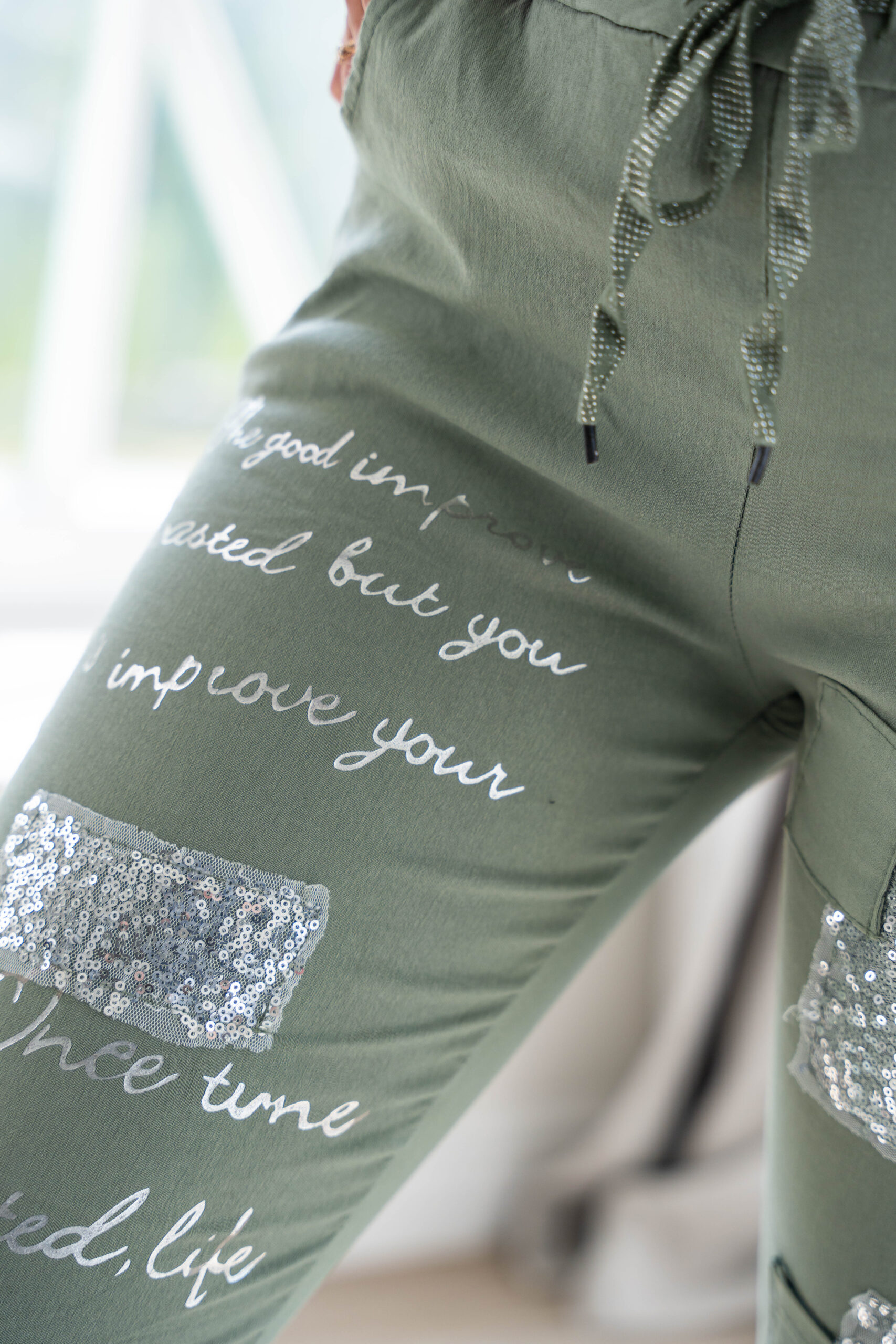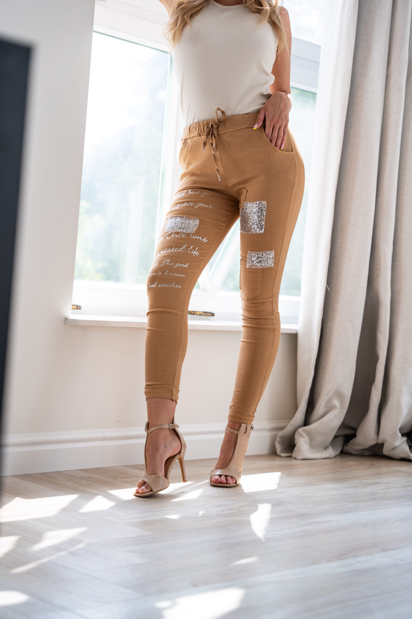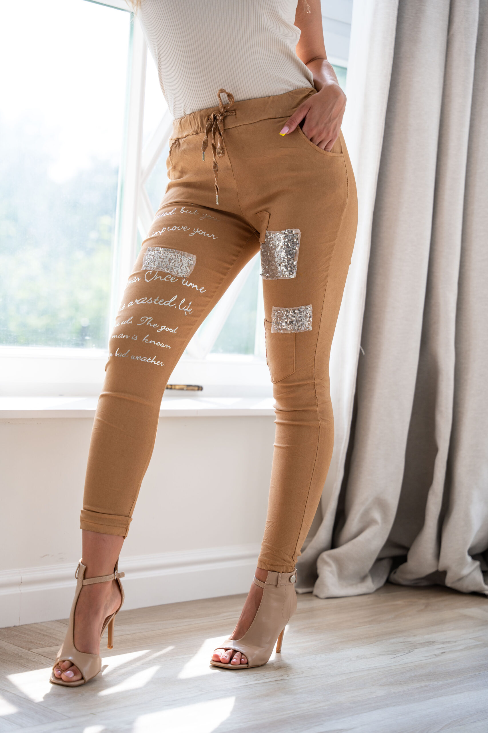 Bawełniane spodnie wykonane z elastycznej, ładnie pracującej bawełny. Model wsuwany ze sznurkiem w pasie i ozdobnymi aplikacjami. Z przodu kieszenie, tył gładki. Pas elastyczny. Podane wymiary poniżej mierzone są na płasko bez rozciągnięcia materiału.