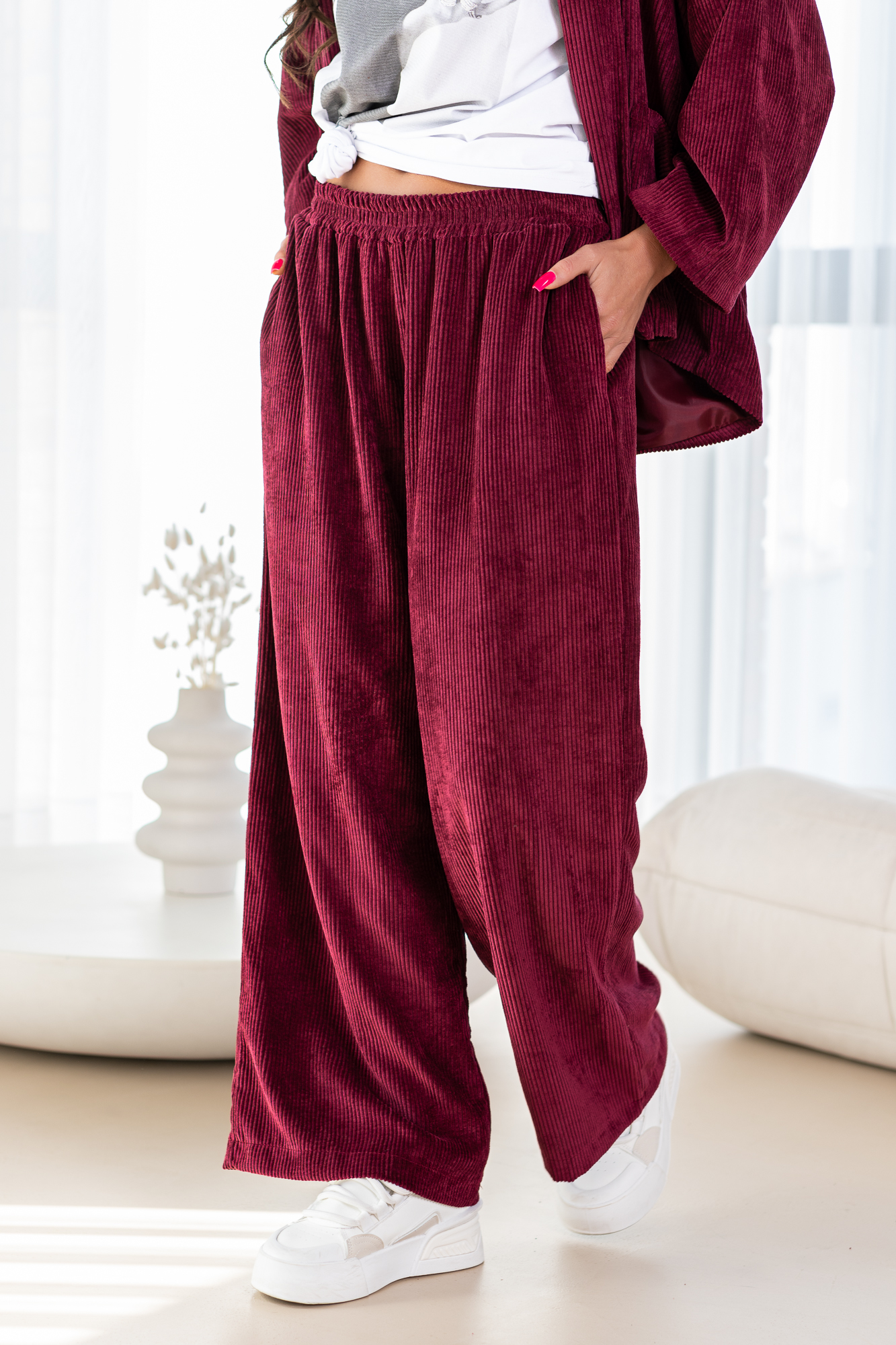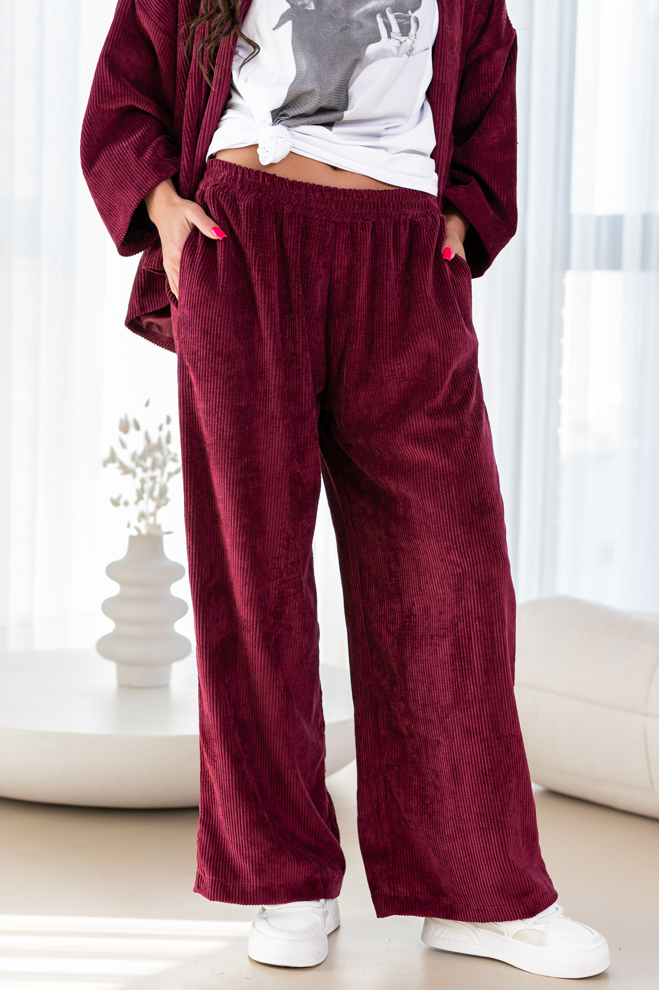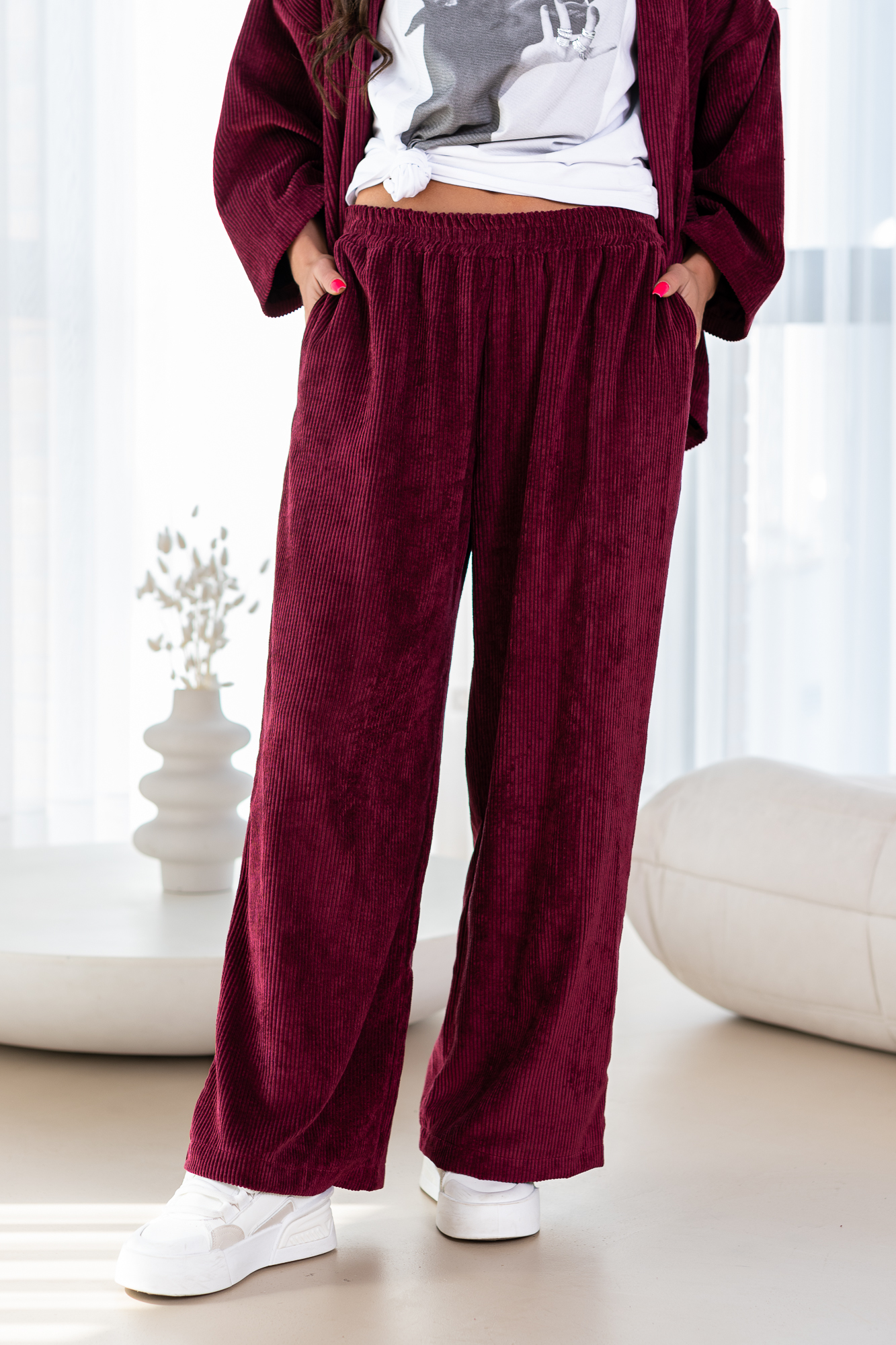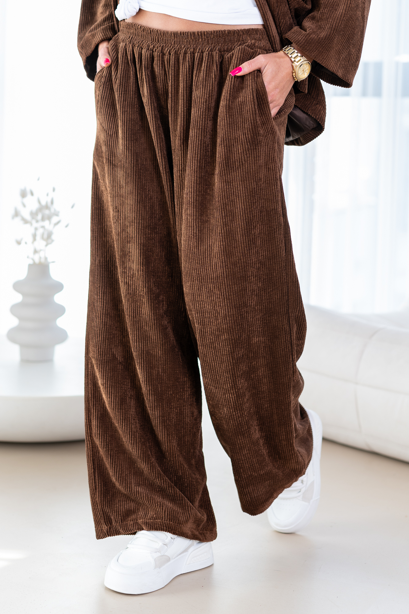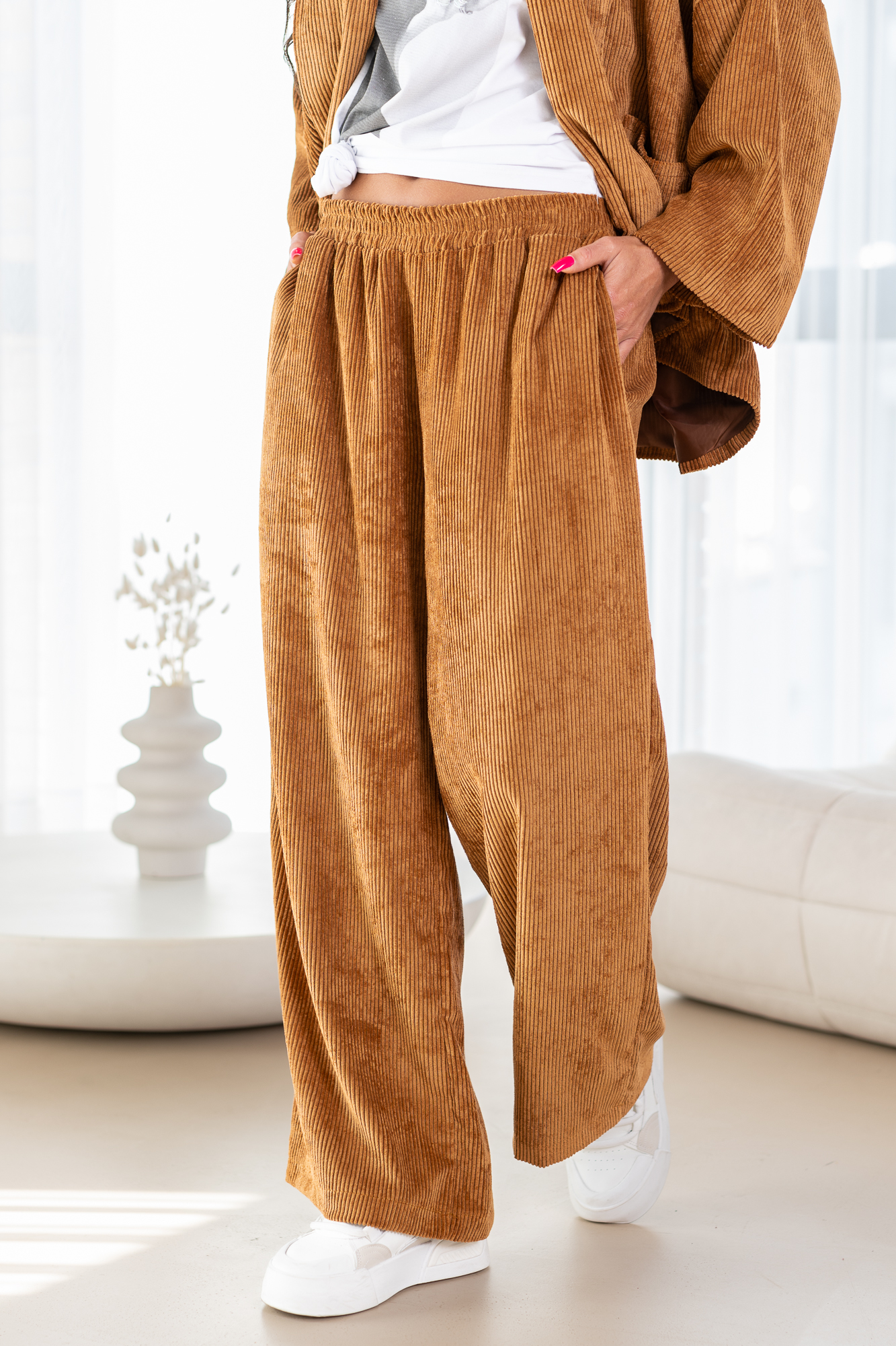 Spodnie Szimi to spodnie o prostej nogawce. Mają elastyczną gumkę w pasie, co zapewnia wygodne dopasowanie. Spodnie wyposażone są w praktyczne kieszenie, dodając funkcjonalności do ich stylowego wyglądu. To modny i wygodny wybór, który doda swobody każdej casualowej stylizacji. Materiał spodni to gruby sztruks.