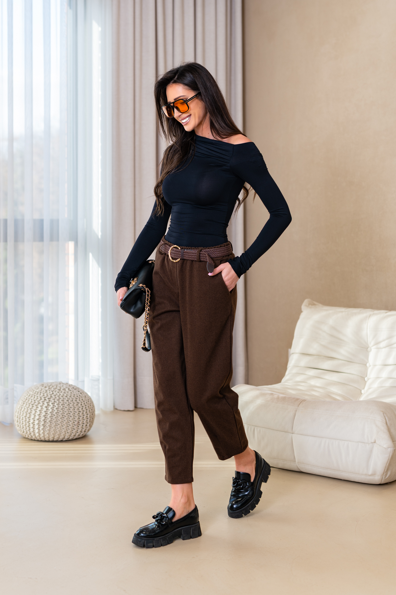 Spodnie Tiara – to spodnie o poszerzanej nogawce lekko zwężanych ku dołowi. Mają elastyczną gumkę w pasie, co zapewnia wygodne dopasowanie. Spodnie wyposażone są w praktyczne kieszenie, dodając funkcjonalności do ich stylowego wyglądu. To modny i wygodny wybór, który doda swobody każdej casualowej stylizacji. Spodnie sprzedawane są w komplecie z paskiem.