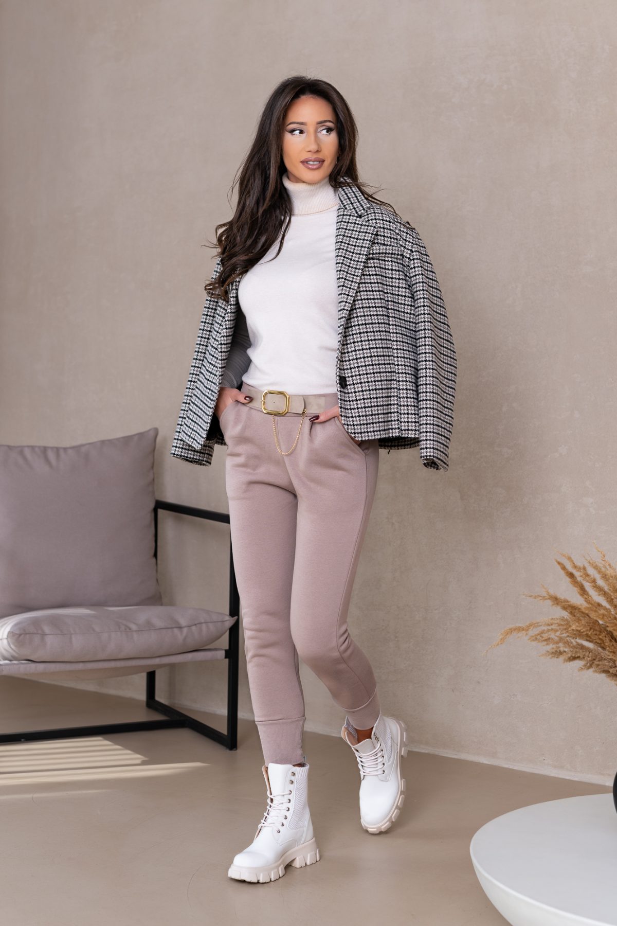 Spodnie, które są niezbędnym elementem każdej garderoby. Wykonane z najwyższej jakości miękkiego/grubego materiału, zapewniają komfort noszenia i doskonałe dopasowanie przez cały dzień. Ich nowoczesny krój z elastycznym wykończeniem nogawek oraz stylowy, ozdobny pasek podkreślają sylwetkę i dodają wyrafinowania każdej stylizacji. Spodnie posiadają praktyczne kieszenie, które zwiększają ich funkcjonalność, czyniąc je idealnym wyborem zarówno na casualowe wyjścia, jak i bardziej formalne spotkania. Te spodnie będą Twoim ulubionym wyborem na każdą okazję. JAKOŚĆ PREMIUM – ocieplone.