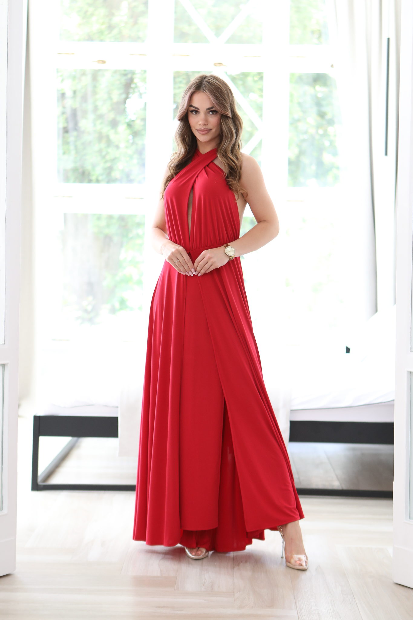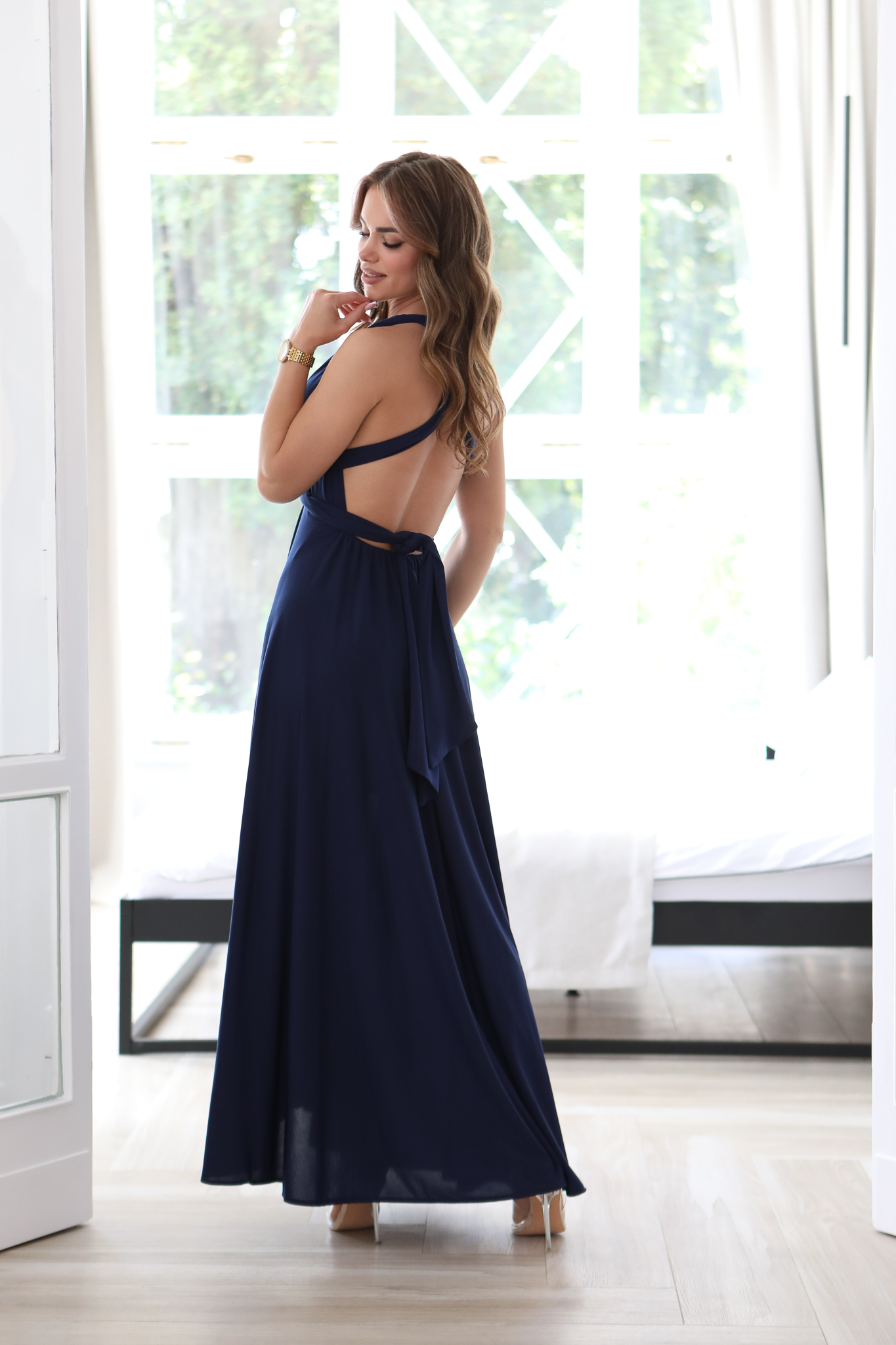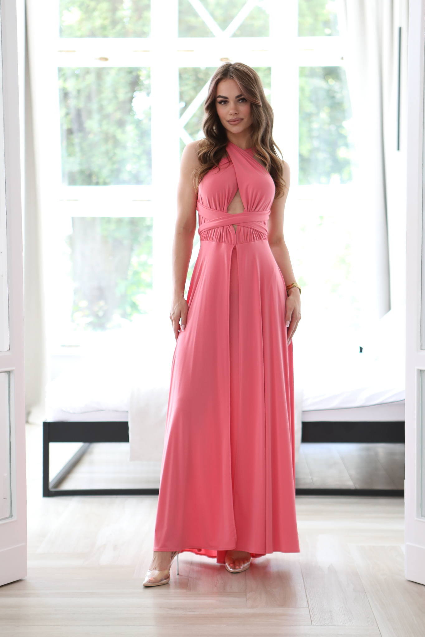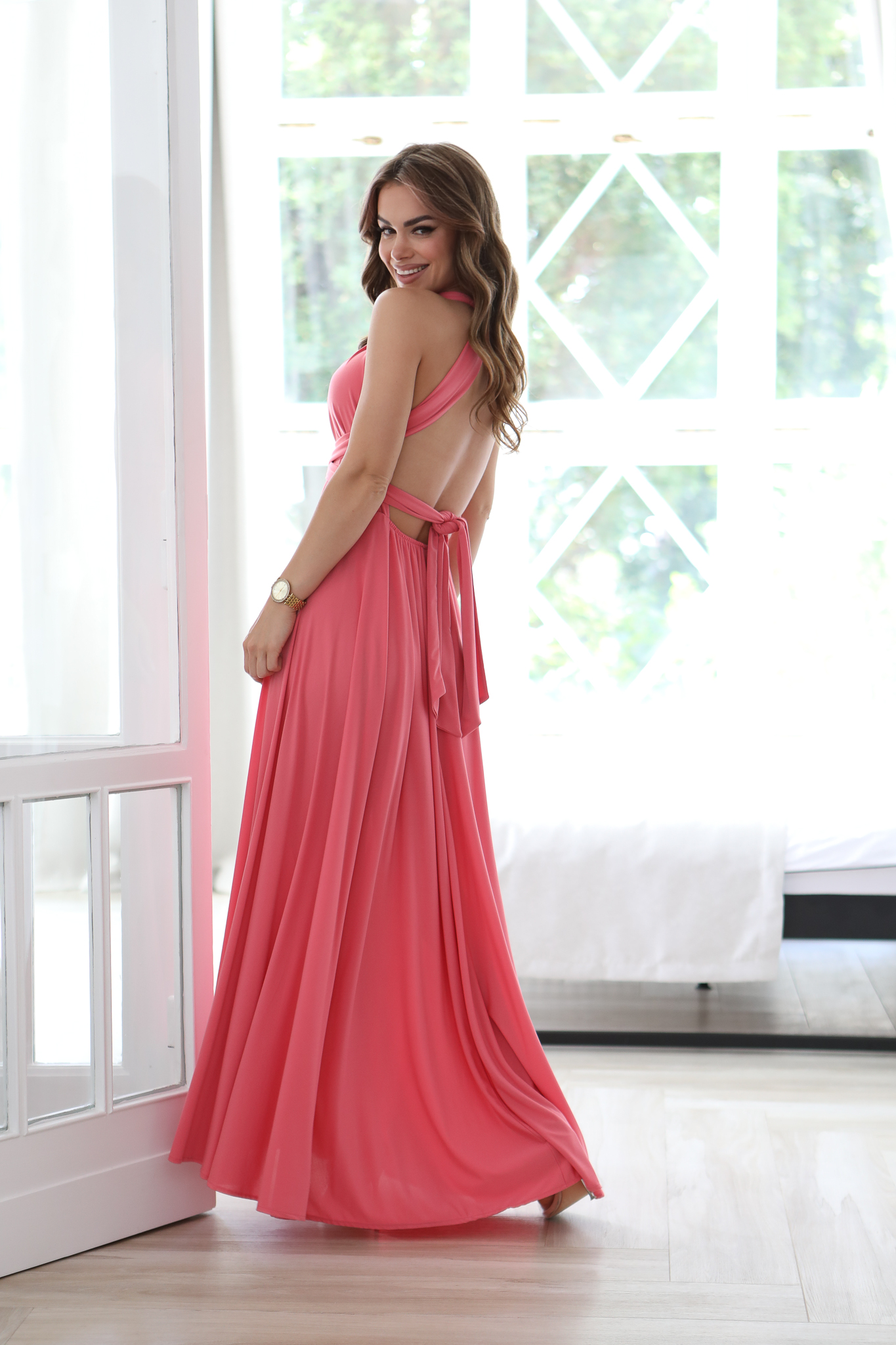 Ta Sukienka to bardzo – kobiecy model, który pięknie prezentuje się na sylwetce. Góra z szerokimi ramiączkami, które mogą być dowolnie zawiązana – wszystko zależy od fantazji osoby która będzie nosić tą sukienkę. W pasie gumka dzięki której sukienka dopasowuje się do sylwetki. Szeroki dół sukienki i głębokie rozcięcia to ponadczasowy hit, który wspaniale wygląda ze szpilkami. Sukienkę można założysz na niemal każdą okazję. Produkt polskiej produkcji.