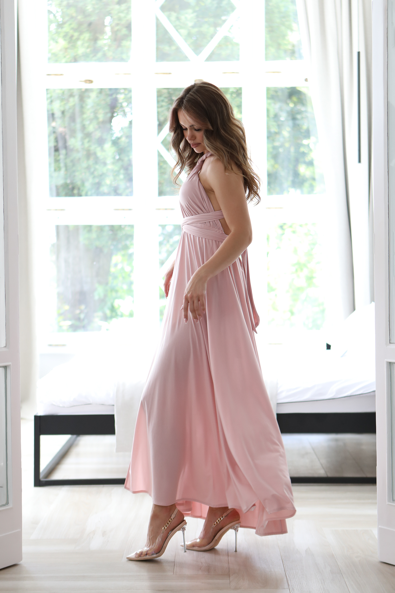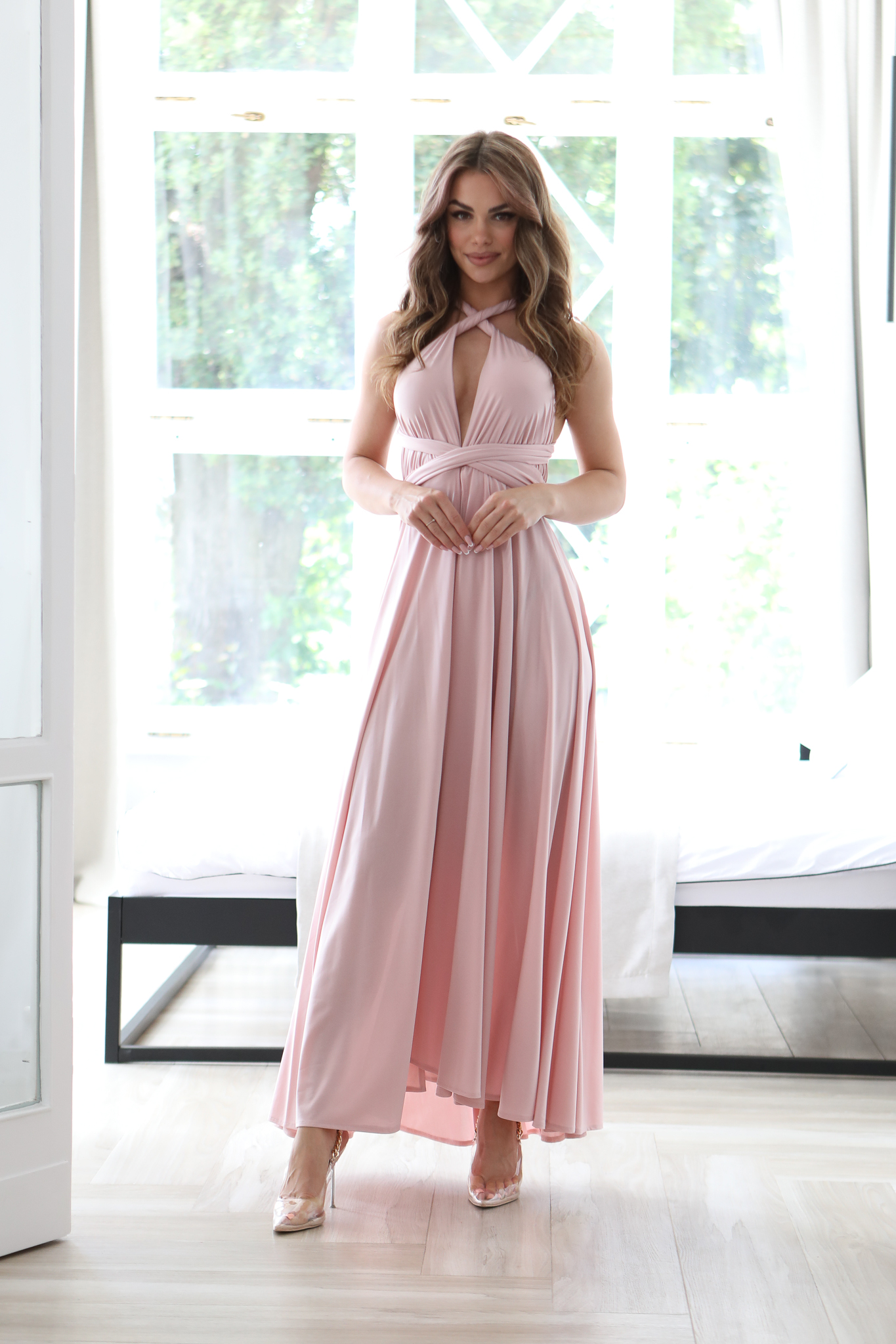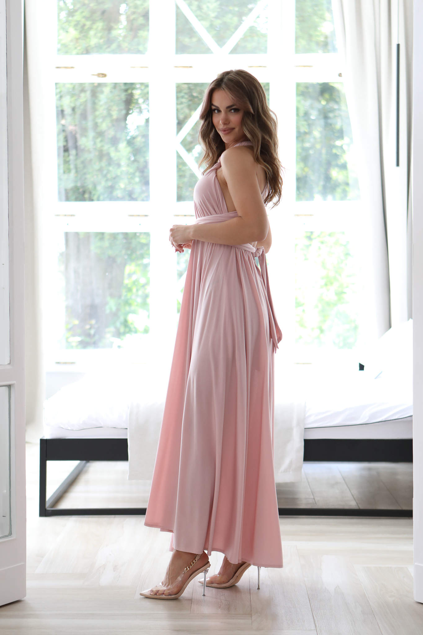 Ta Sukienka to bardzo – kobiecy model, który pięknie prezentuje się na sylwetce. Góra z szerokimi ramiączkami, które mogą być dowolnie zawiązana – wszystko zależy od fantazji osoby która będzie nosić tą sukienkę. W pasie gumka dzięki której sukienka dopasowuje się do sylwetki. Szeroki dół sukienki i głębokie rozcięcia to ponadczasowy hit, który wspaniale wygląda ze szpilkami. Sukienkę można założysz na niemal każdą okazję. Produkt polskiej produkcji.