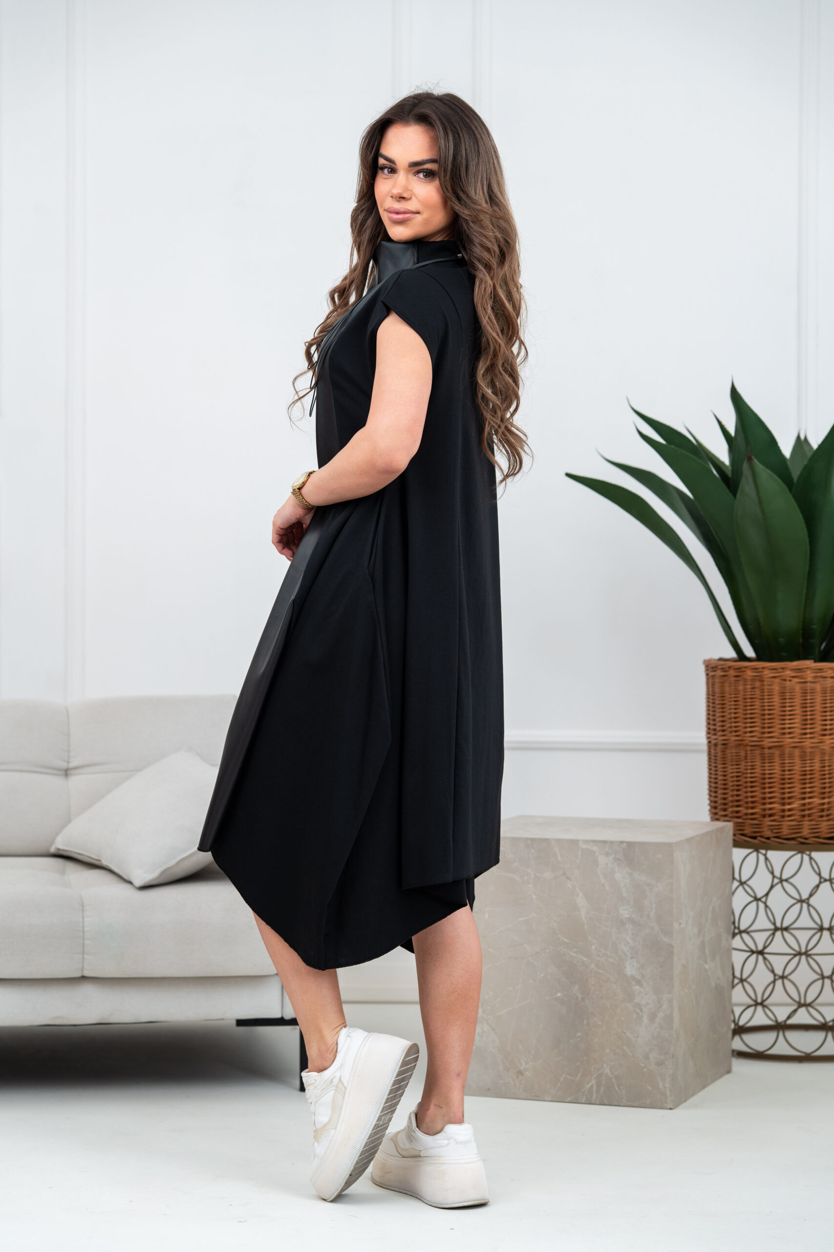 Przedstawiamy naszą zachwycającą czarną sukienkę, która łączy elegancję z nowoczesnym stylem. Wykonana z najlepszej jakości materiału, zapewnia nie tylko wyjątkowy komfort, ale również luksusowy wygląd. Czarny kolor emanuje klasyką i wyrafinowaniem, czyniąc sukienkę idealną na każdą okazję, od formalnych spotkań po eleganckie wyjścia. Prosty krój z połączenie bawełny z ekoskórą sprawia, że sukienka nie tylko pięknie się prezentuje, ale również doskonale dopasowuje się do sylwetki. To idealny wybór dla każdej kobiety, która chce podkreślić swoją wyjątkowość i elegancję z najwyższą klasą. Sprzedawana w komplecie z wisiorkiem – potrójny rzemyk.