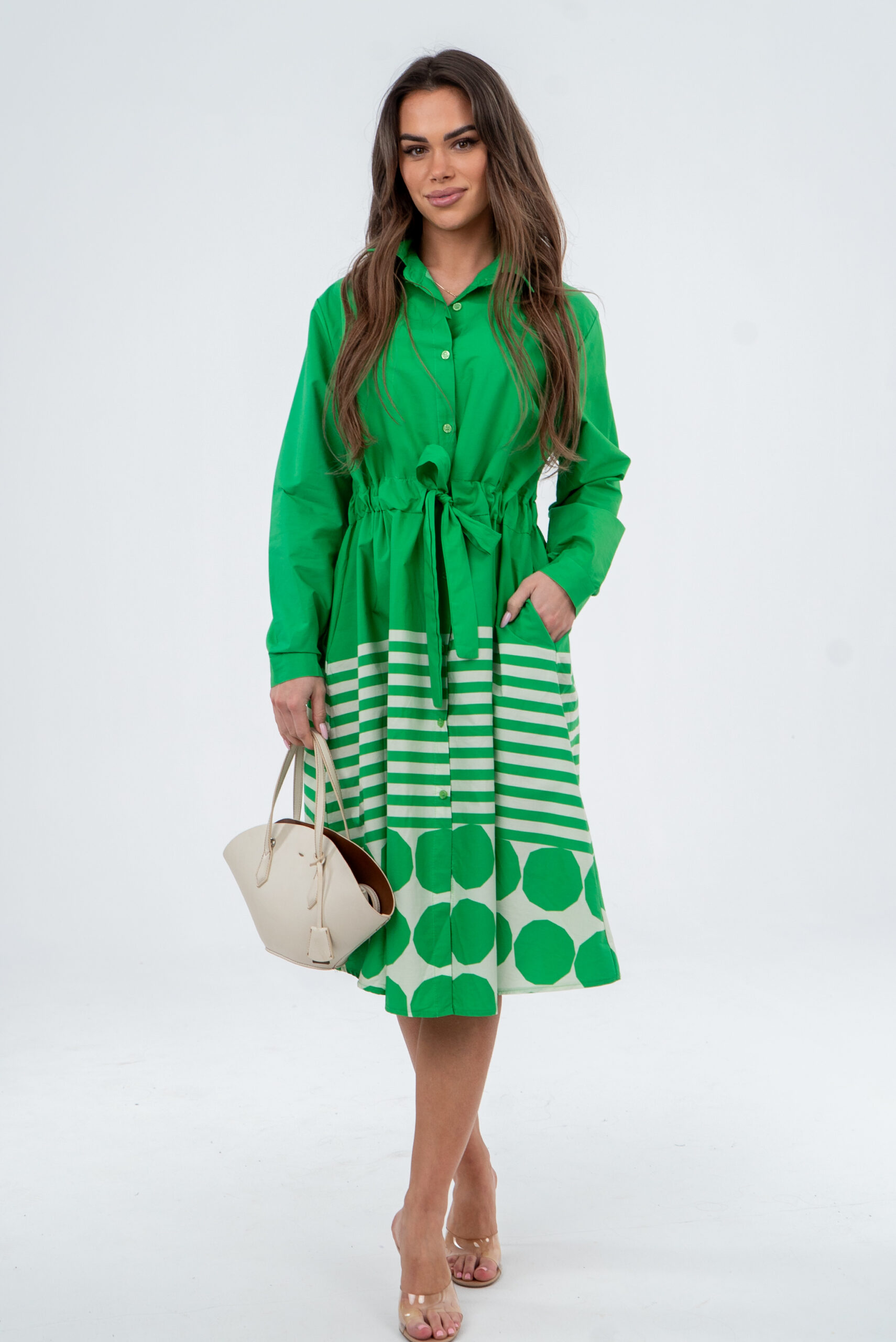 Sukienka w stylu Casual o kształcie trapezu–bardzo kobieca, klasyczna z pazurem. IDELANA NA NADCHODZĄCY CZAS SPOTKAŃ I WYJŚĆ!!! Ten model sukienki sprawią że jesteśmy kobiece a jednak niczym nie skrępowane – regulacja w pasie dowolne wiązanie. Gładka z kołnierzykiem i dekoltem w serek idealnie dopasowuje się do figury i podkreśla kobiece atuty. W pasie szeroka szarfa z możliwością dowolnego wiązania po bokach dwie kieszenie. Krój oversize – modelka na zdjęciu nosi rozmiar S i ma 173cm wzrostu (rozmiar S/M).Wymiary na płasko bez naciągania – materiał naddaje się i ładnie pracuje na sylwetce