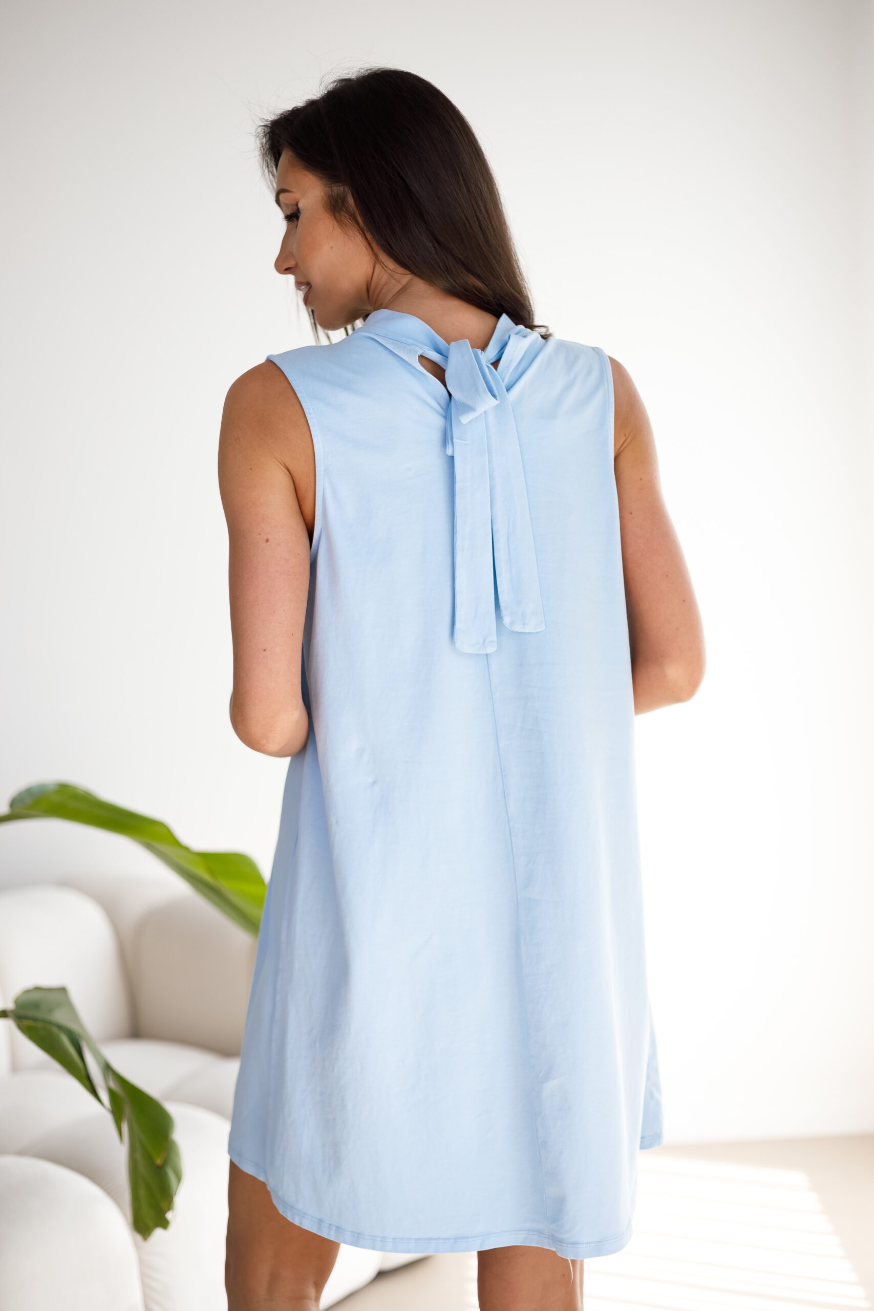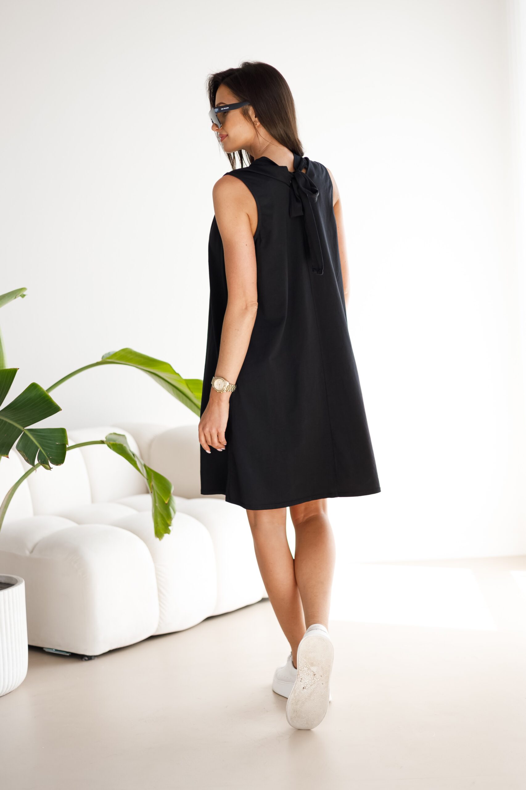 Kobieca, lekka, zwiewna, klasyczna, mega wygodna i ponadczasowa – CUDOWNA! Ta sukienka doda każdej kobiecie lekkości, finezji i uroku. Idealnie sprawdzi się w eleganckich, jak i codziennych stylizacjach. Doskonała na każdą okazję. Sukienka ma trapezowy kształt co powoduje, że na każdej sylwetce układa się dobrze a subtelne wiązanie na szyi dodaje jej uroku i finezji.
