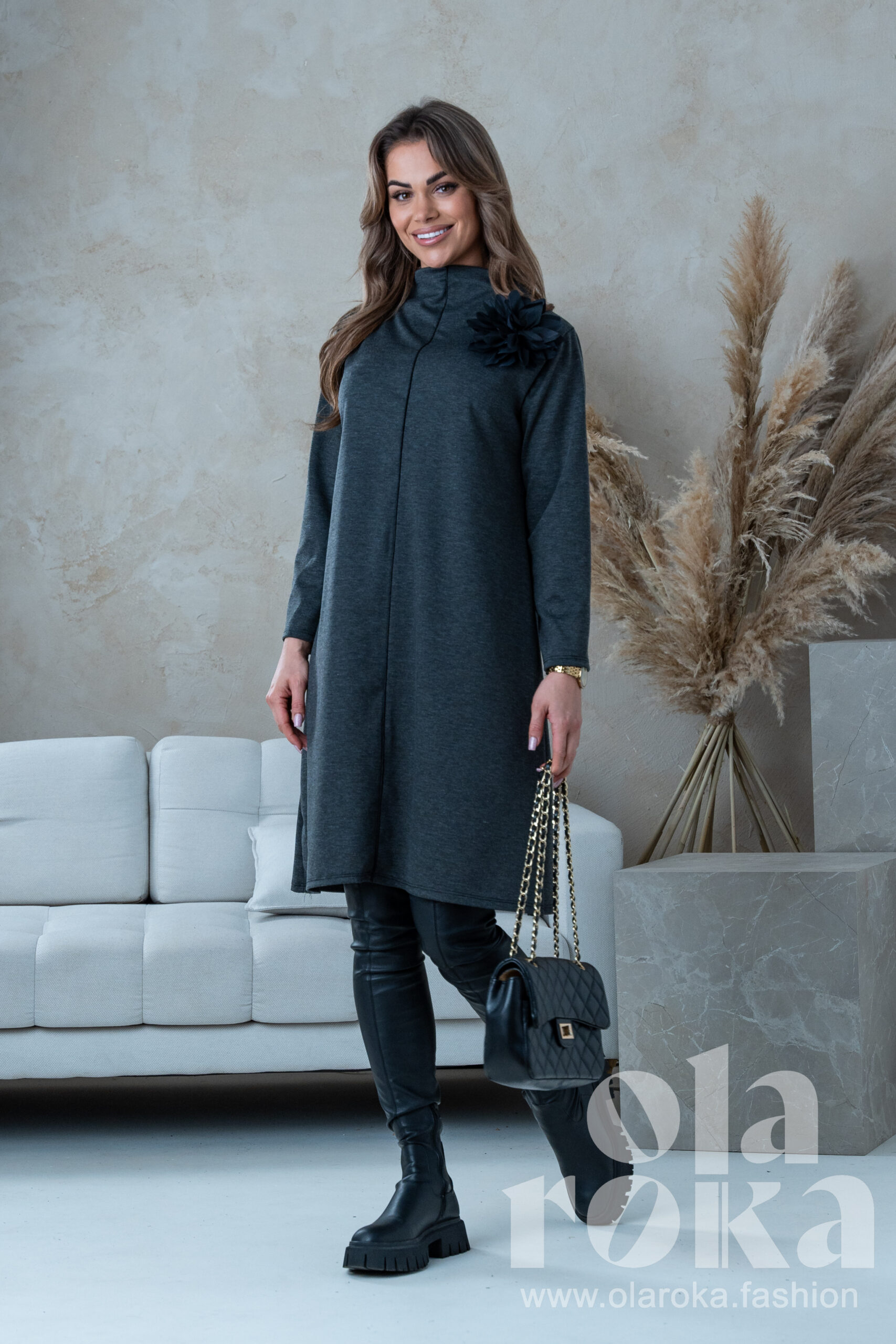 Odkryj naszą wspaniałą sukienkę, która łączy w sobie prostotę i wyrafinowanie, tworząc idealny wybór na każdą okazję. Wykonana z elastycznego materiału, gwarantuje miękkość i komfort noszenia przez cały dzień. Głęboka czerń i grafit dodaje jej eleganckiego charakteru i świetnie komponuje się z różnorodnymi dodatkami. Sukienka osiąga nowoczesny wygląd dzięki delikatnemu, luźnemu krojowi i efektownemu detalowi w postaci kwiatu na ramieniu. Zapewnia swobodę, nie rezygnując z elegancji. To idealna propozycja dla kobiet ceniących komfort i szyk.