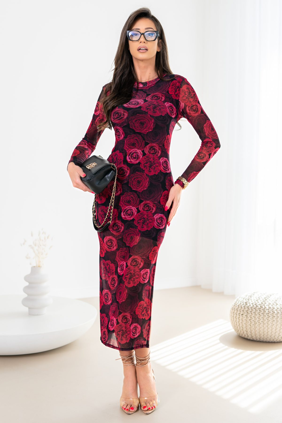 Nowy wymiar elegancji z naszą efektowną sukienką midi w odcieniach bordo z przyciągającym wzrok wzorem. Ta szykowna kreacja, wykonana z lekkiego, elastycznego materiału, idealnie dopasowuje się do sylwetki, podkreślając jej atuty. Przezroczyste elementy oraz stylowe długie rękawy dodają jej subtelnej zmysłowości, czyniąc ją doskonałym wyborem zarówno na wieczorne wyjścia, jak i wyjątkowe okazje. Sukienka łączy w sobie nowoczesność z klasycznym odcieniem bordo, dodając każdej stylizacji wyrafinowanego charakteru.