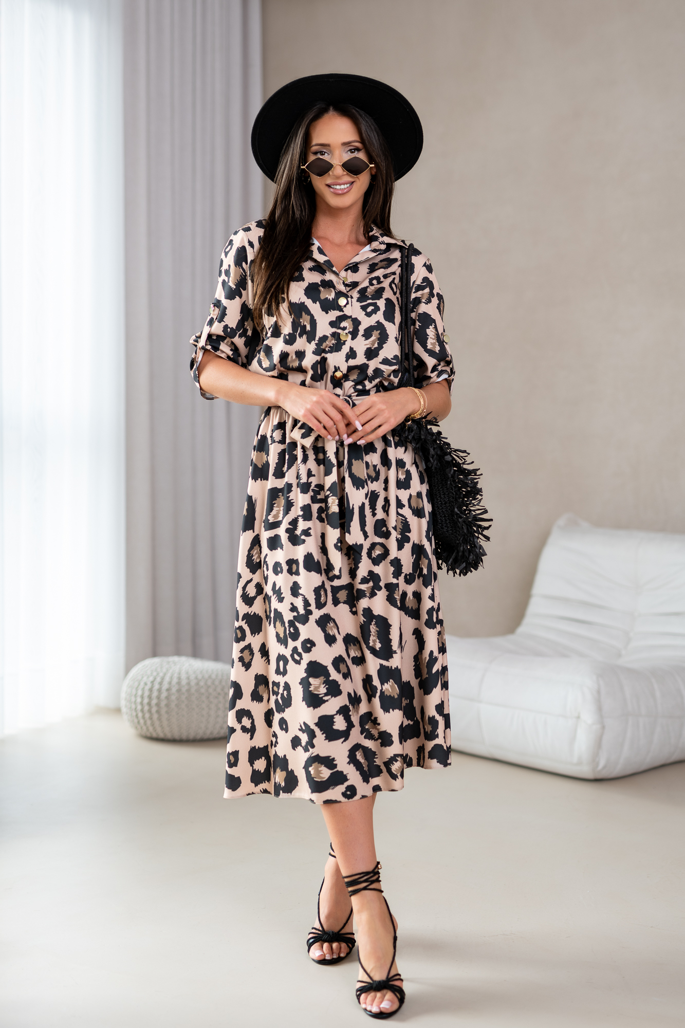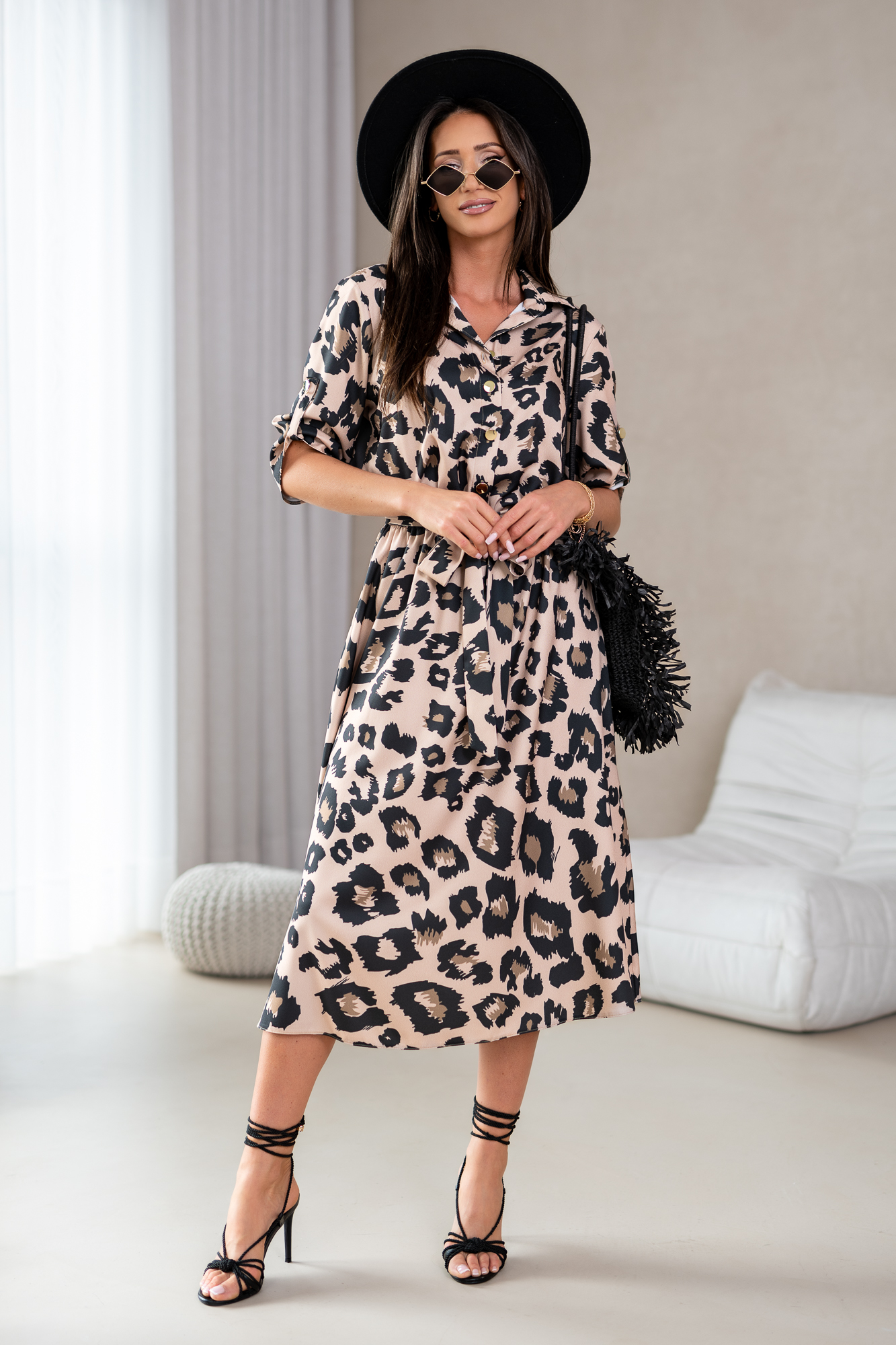 Bądź wyjątkowa, bądź inna, wyróżnij się z tłumu? Sukienka w stylu Casual – sexowna, kobieca, klasyczna a jednak pazurem. IDELANA NA NADCHODZĄCY CZAS SPOTKAŃ I WYJŚĆ!!! Ten model sukienki sprawią że jesteśmy niezwykle kobiece a jednak niczym nie skrępowane. Niebanalny print, w pasie można nosić z paskiem lub bez niego, klasyczny dekolt i subtelne guziczki a po bokach sukienki dwie wygodne kieszenie. Rękaw ma możliwość skrócenia poprzez podpięcie go na guzik. Sukienka sprzedawana w komplecie z paskiem materiałowym.