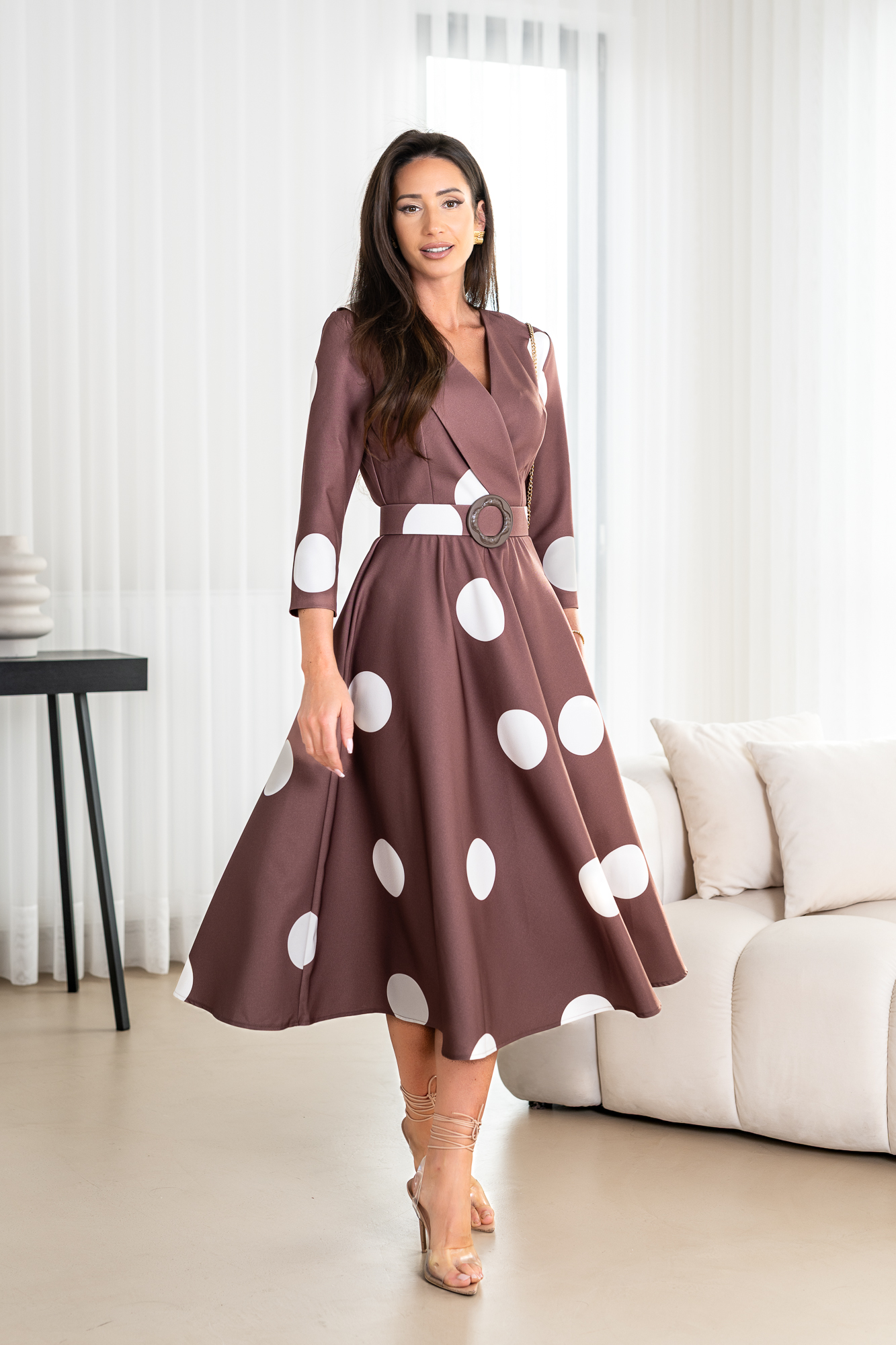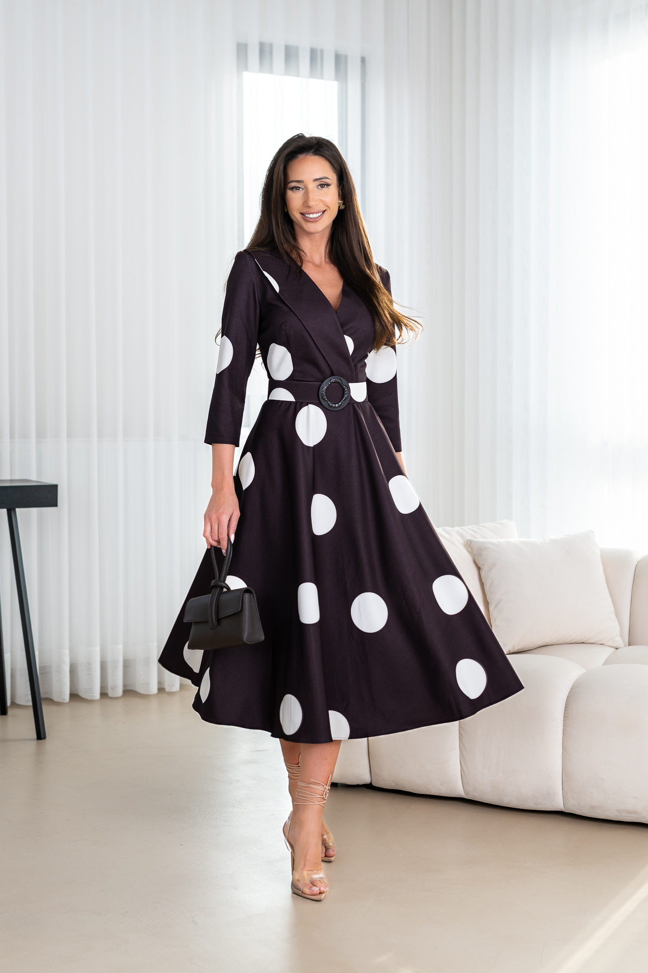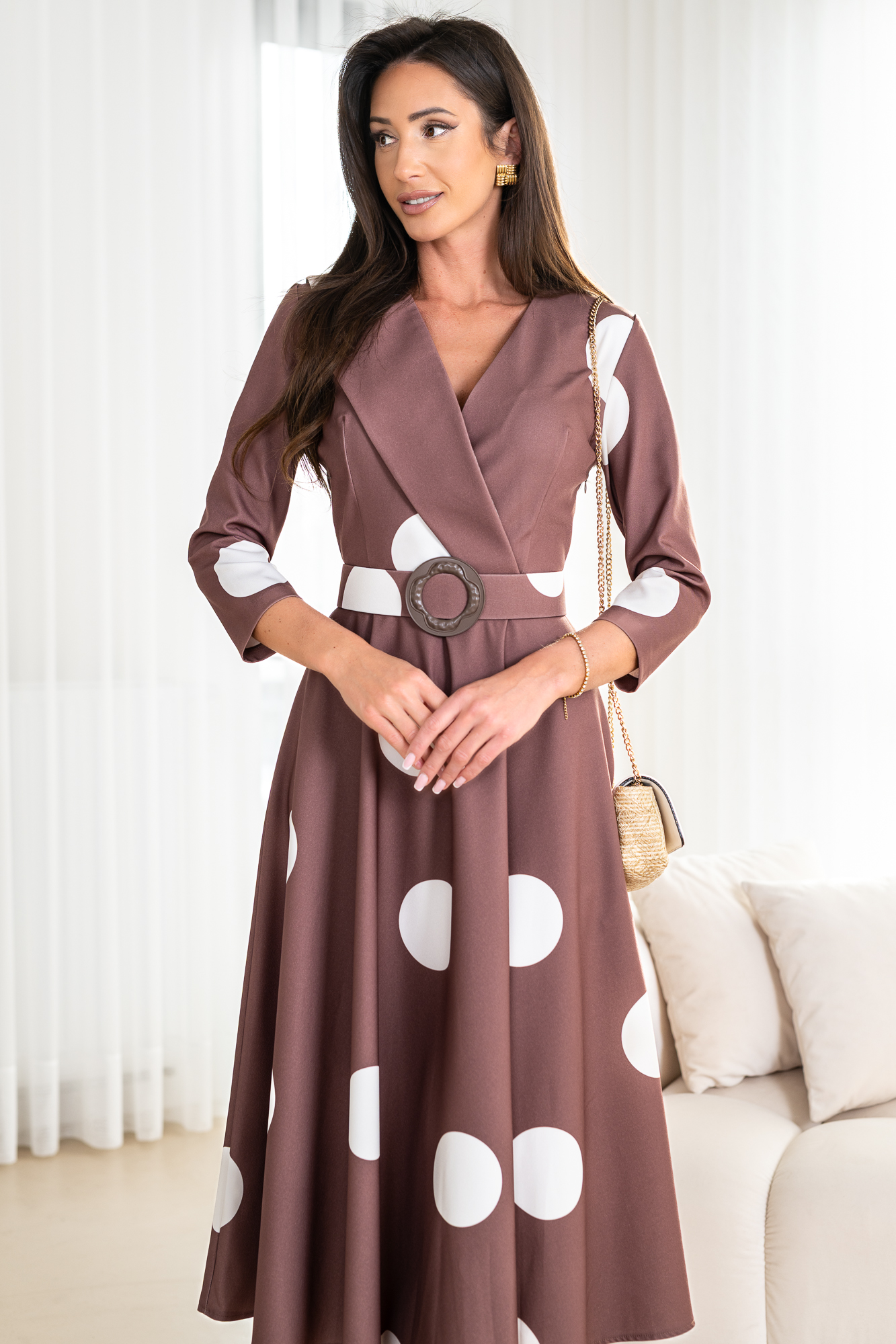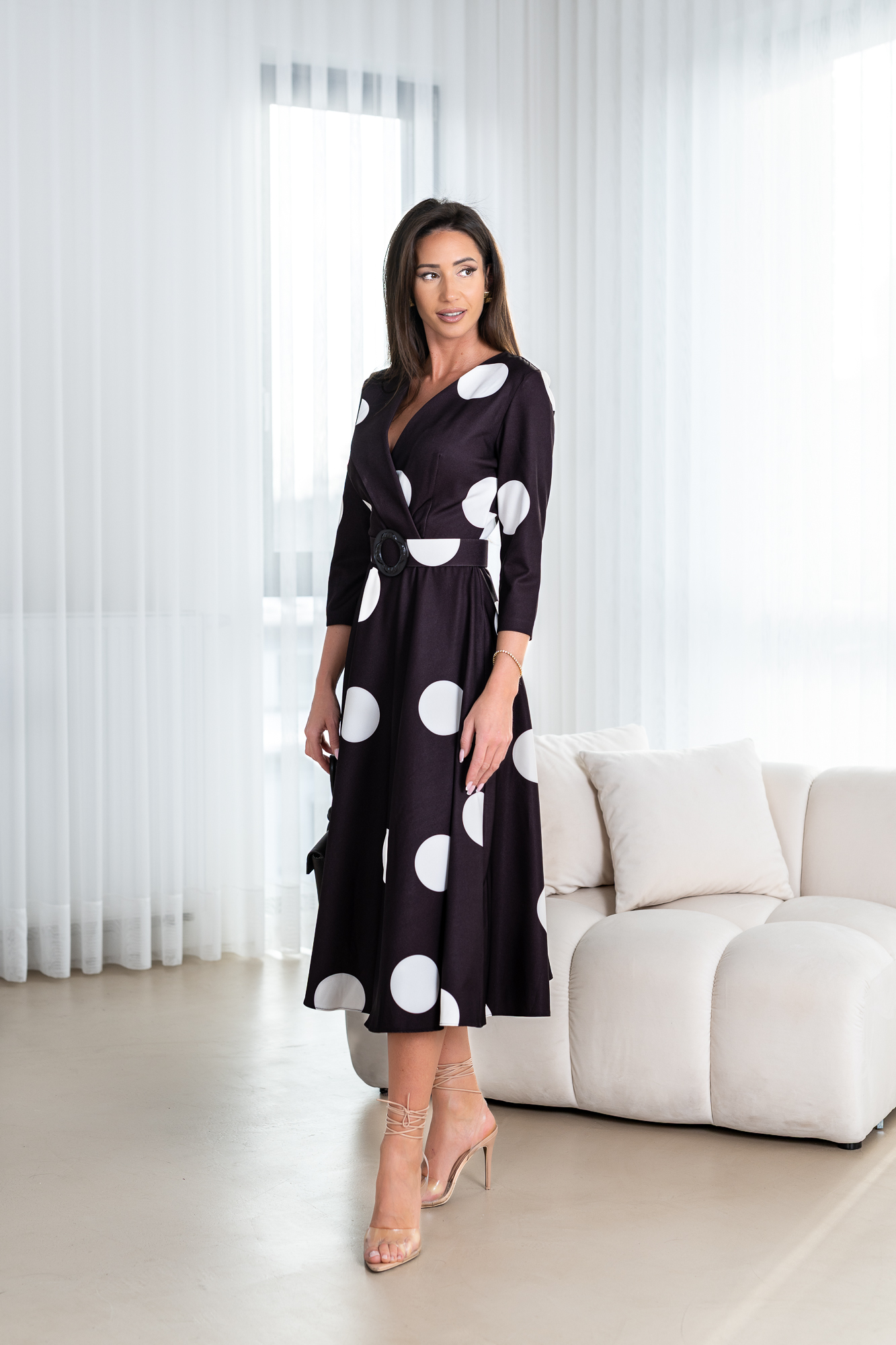 Lekka i pełna wdzięku sukienka stworzona z myślą o wiosennych stylizacjach. Kopertowy dekolt subtelnie podkreśla sylwetkę, a delikatnie zaznaczona talia nadaje całości kobiecych proporcji. Zwiewny dół o długości midi pięknie układa się w ruchu, zapewniając komfort i swobodę noszenia przez cały dzień. Rękawy o długości 3/4 dodają stylizacji miękkości i elegancji. To model, który doskonale sprawdzi się zarówno na co dzień, jak i na wiosenne spotkania czy wyjątkowe okazje.