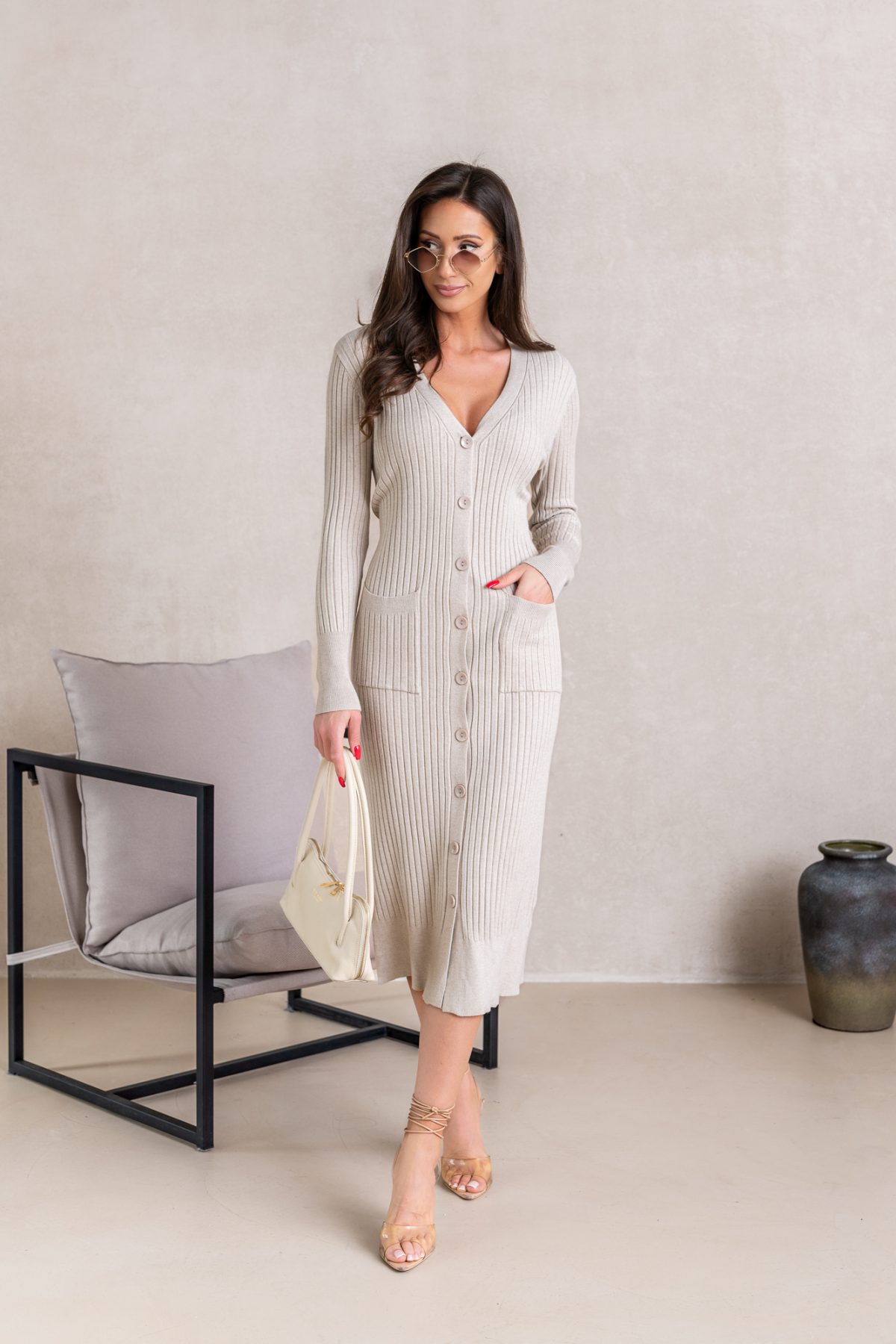 Długość midi, prosty krój, otulająca i dająca komfort noszenia. Kobiecy krój. Jeśli ja odepniesz i załaożysz pod nią spodnie i top będzie idealnym kardiganem 🙂