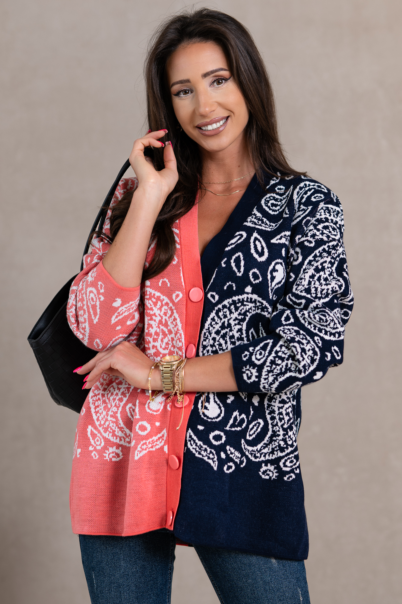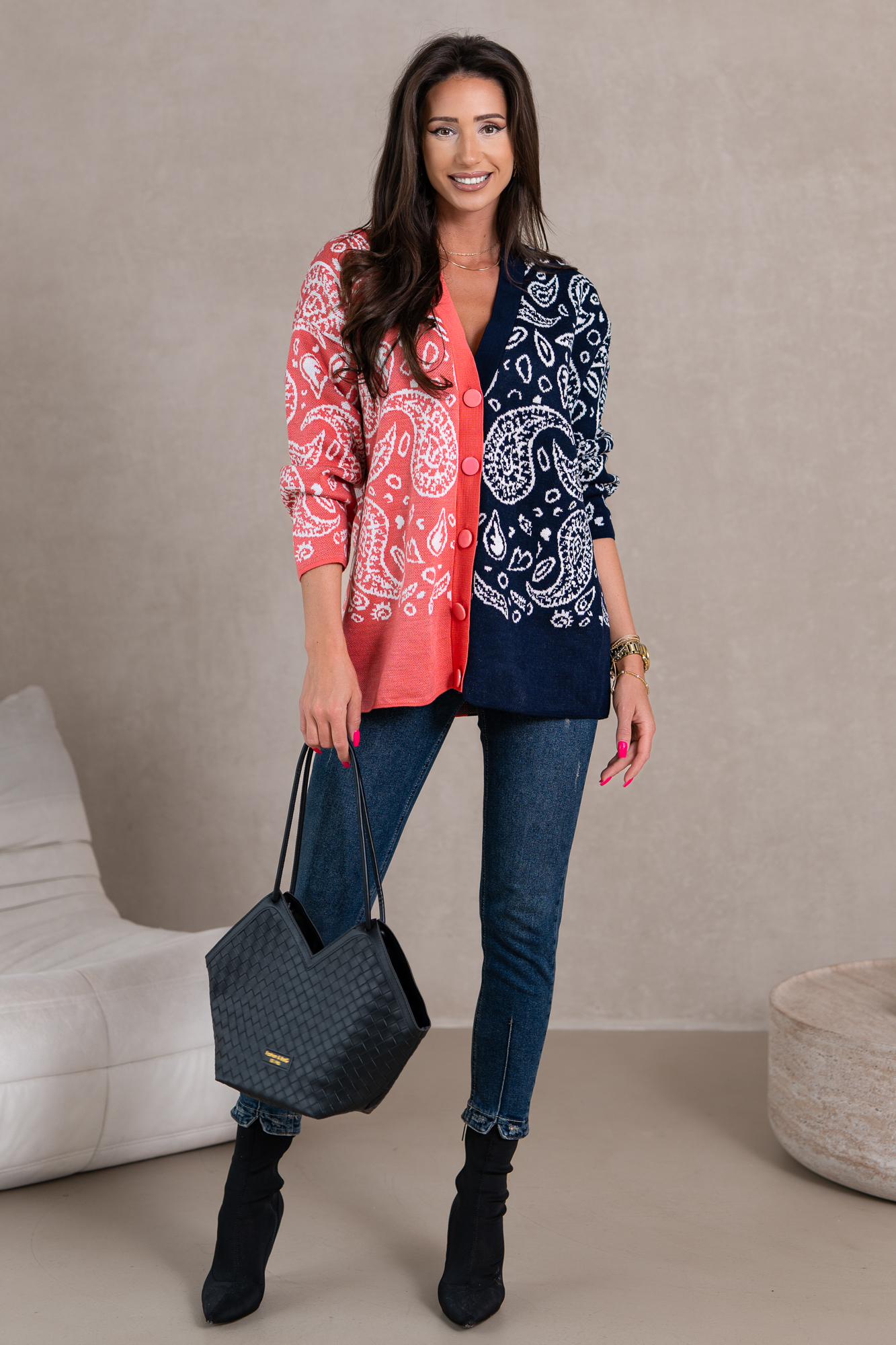 Sweter o dłuższym, prostym kroju, który świetnie wydłuża sylwetkę oraz tuszuje ewentualne niedoskonałości:-) Doskonale będzie prezentował się zarówno w eleganckich, jak i codziennych stylizacjach. Wygodny o prostym kroju – must have w szafie każdej kobiety. Idealny do pracy i na spacer. Wygląda świetnie zarówno z jeansami jak i z tiulowymi spódnicami. Jego materiał jest miękki, dobrze dopasowuje się do sylwetki i nie krępuje ruchów. W rześkie dni posłuży jako alternatywa dla lekkich kurtek i wygodnych bluz. Modelka na zdjęciu nosi rozmiar „S” ma 173cm wzrostu.