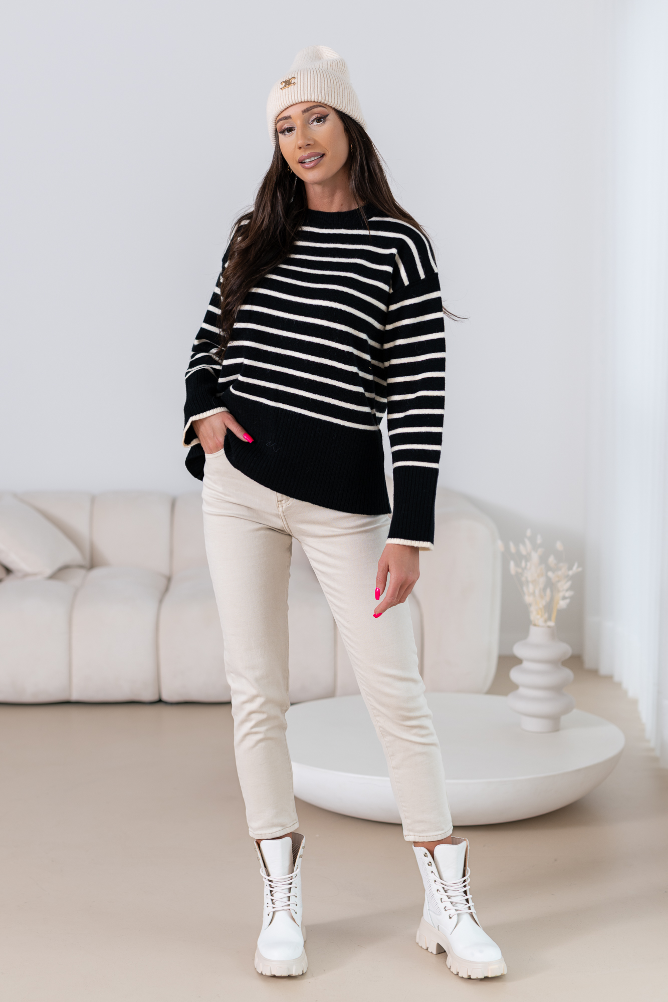 Casualowy sweter w dwóch zestawach kolorystycznych który idealnie sprawdzi się na nadchodzącą porę roku. Klasyczny i ponadczasowy wzór, obniżona linia ramion. Ten ponadczasowy model pozostanie w twojej szafie na wiele lat.