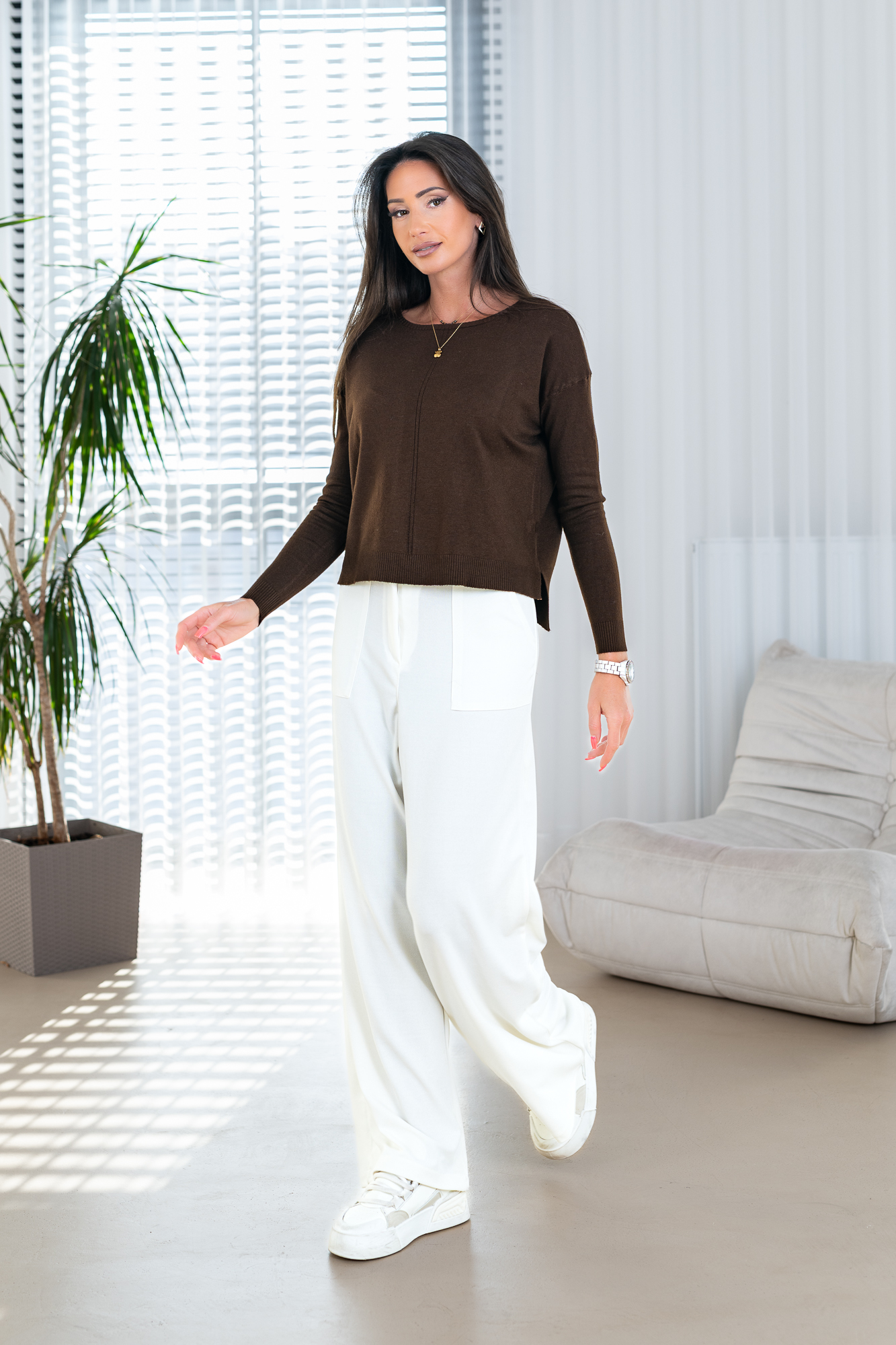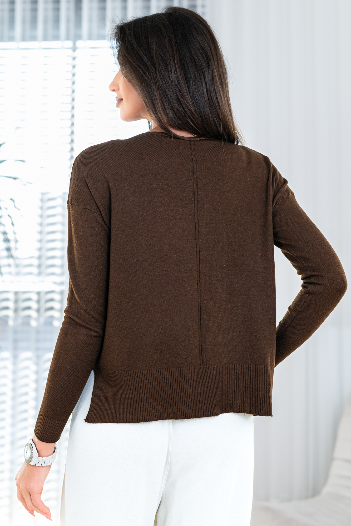 Lekki sweter o prostym kroju z delikatnym wykończeniem, idealny do codziennych stylizacji.