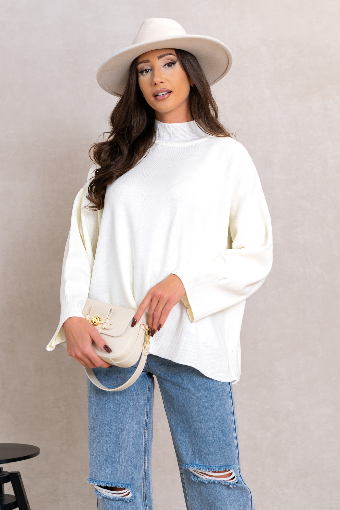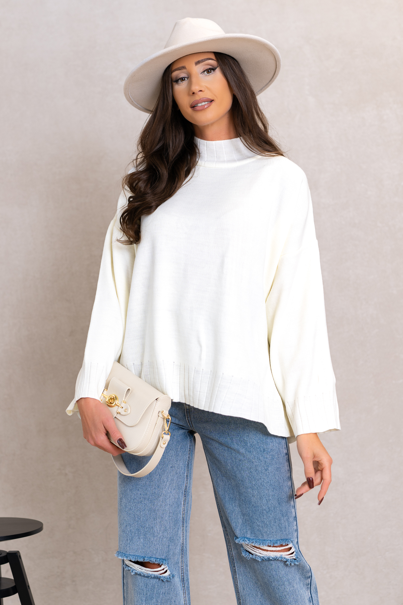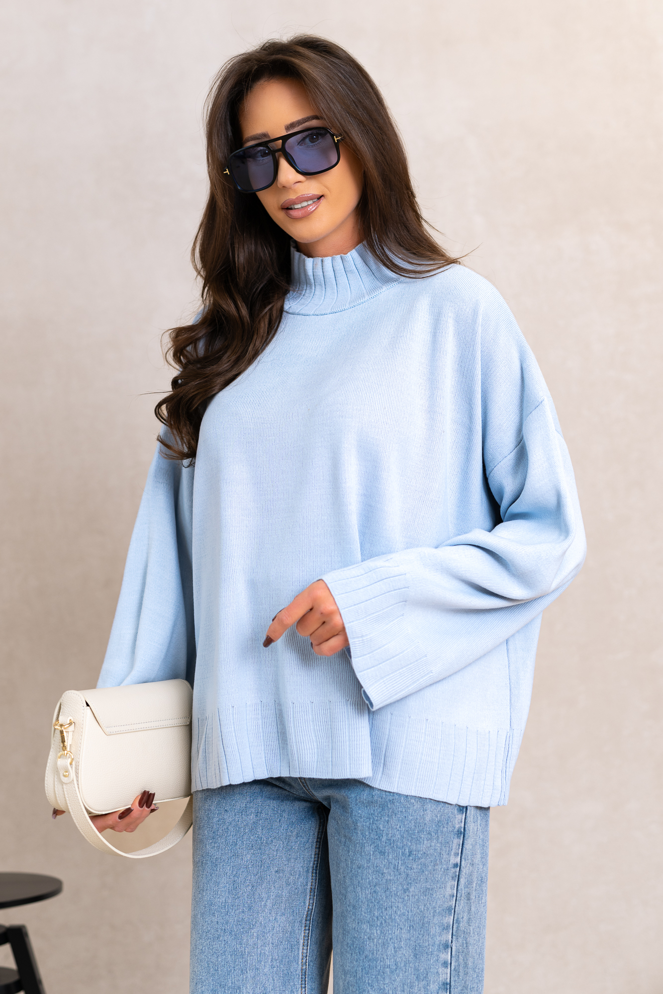 Genialny, klasyczny model swetra w najmodniejszym kroju tego sezonu. Otuli Cię swym ciepłem i zapewni komfort w chłodne dni. Świetnie będzie się prezentował z jeansami, legginsami lub spódniczkami. Luźniejszy oversizowy fason sprawią, że pokochasz go za wygodę noszenia. Szerokie rękawy bez ściągaczy i lekki delikatny półgolf.