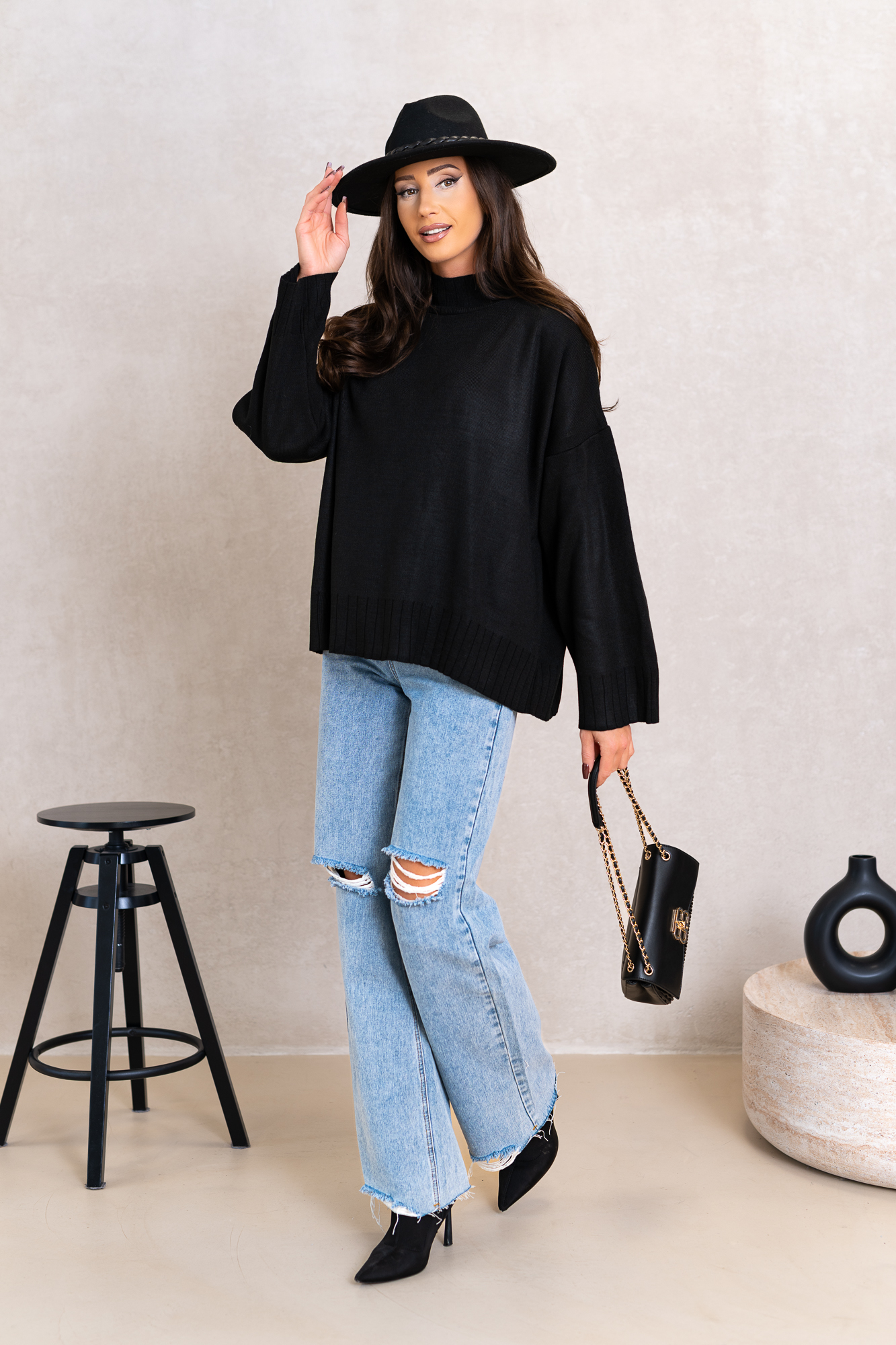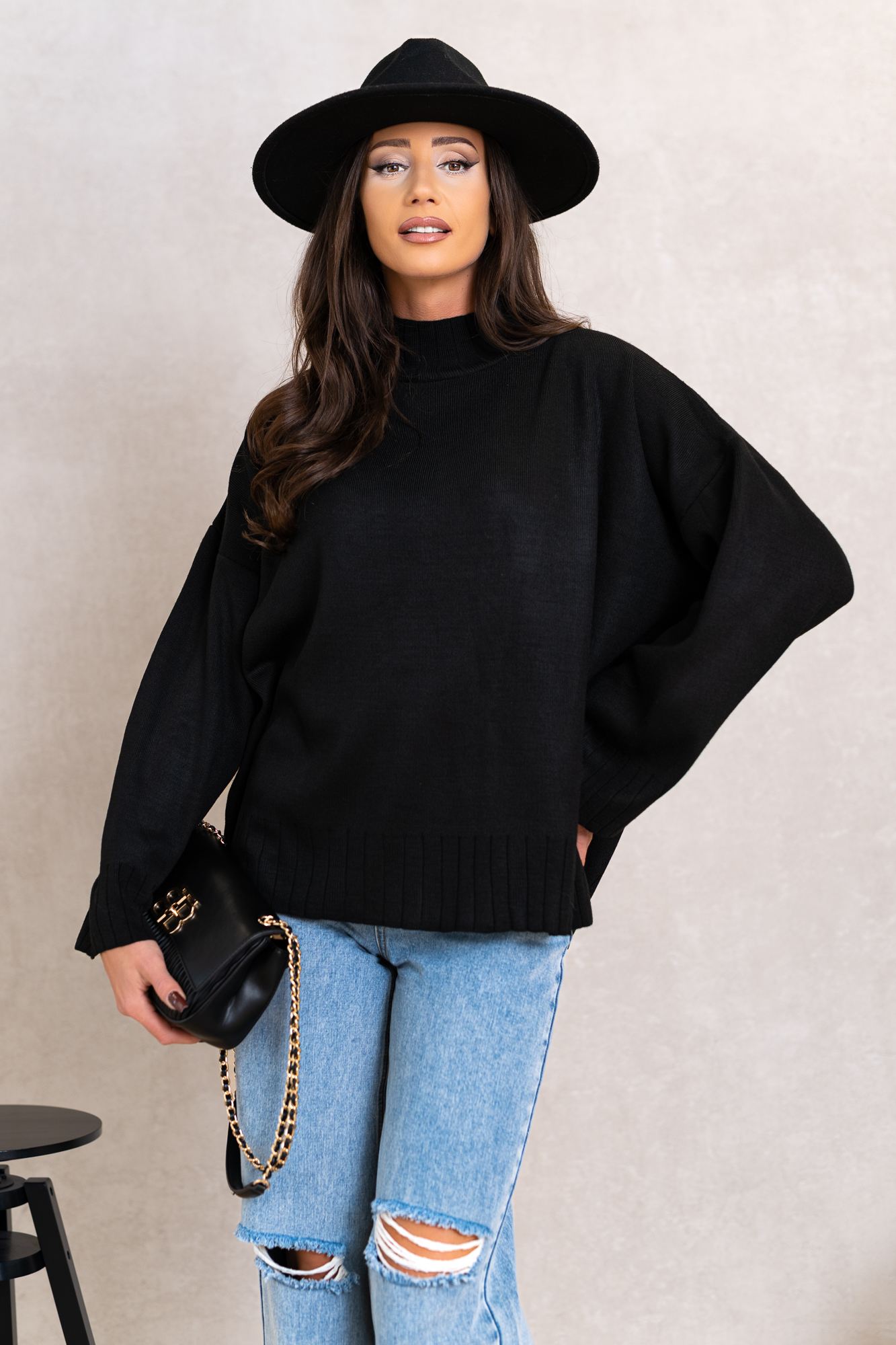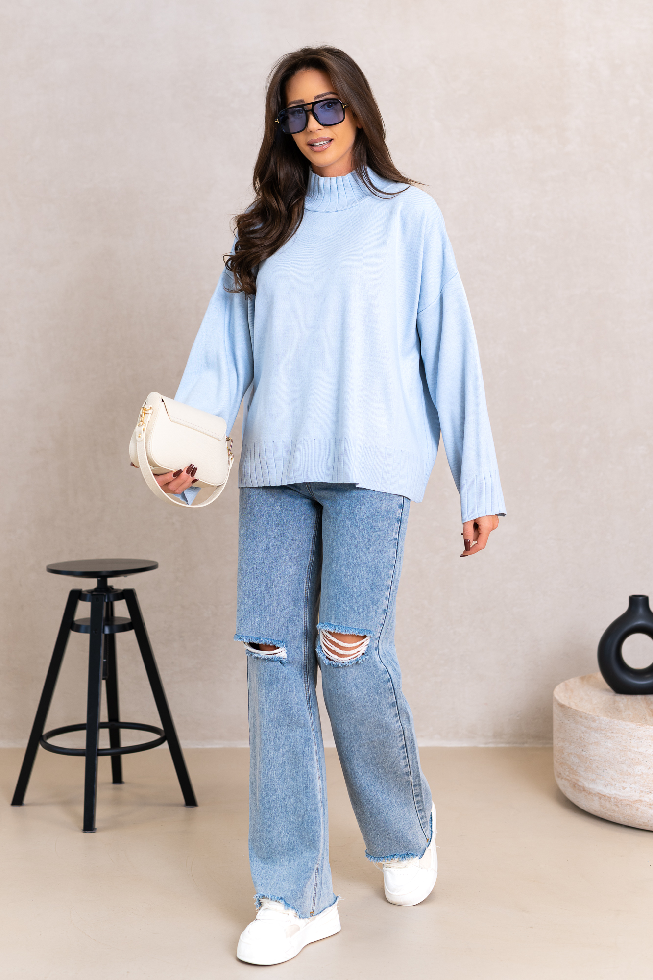 Genialny, klasyczny model swetra w najmodniejszym kroju tego sezonu. Otuli Cię swym ciepłem i zapewni komfort w chłodne dni. Świetnie będzie się prezentował z jeansami, legginsami lub spódniczkami. Luźniejszy oversizowy fason sprawią, że pokochasz go za wygodę noszenia. Szerokie rękawy bez ściągaczy i lekki delikatny półgolf.