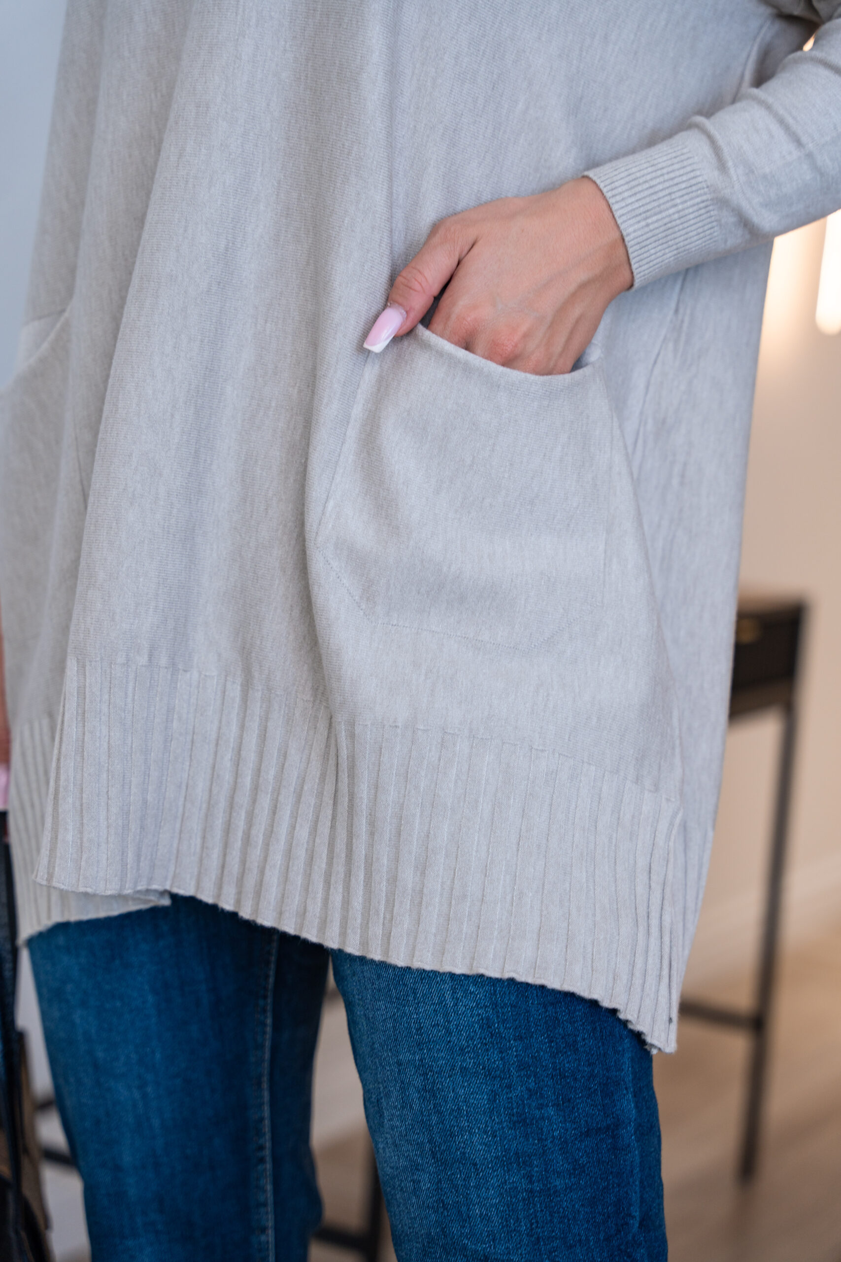 Poznaj nasz luksusowy sweter oversize, który łączy w sobie elegancję i komfort na najwyższym poziomie. Wykonany z najwyższej jakości, miękkiej dzianiny, ten sweter zapewnia przyjemne ciepło i jest niezwykle przytulny w noszeniu. Utrzymany w subtelnym, beżowym odcieniu, idealnie dopasuje się do każdej garderoby, dodając stylu i klasy każdej stylizacji. Krój oversize oraz głęboki dekolt w serek sprawiają, że sweter jest nie tylko modny, ale także niezwykle wygodny, a praktyczne kieszenie dodają mu funkcjonalności. Dostępny w szerokiej gamie rozmiarów, co gwarantuje idealne dopasowanie do każdego typu sylwetki. To doskonały wybór dla tych, którzy nie chcą rezygnować ani ze stylu, ani z wygody.