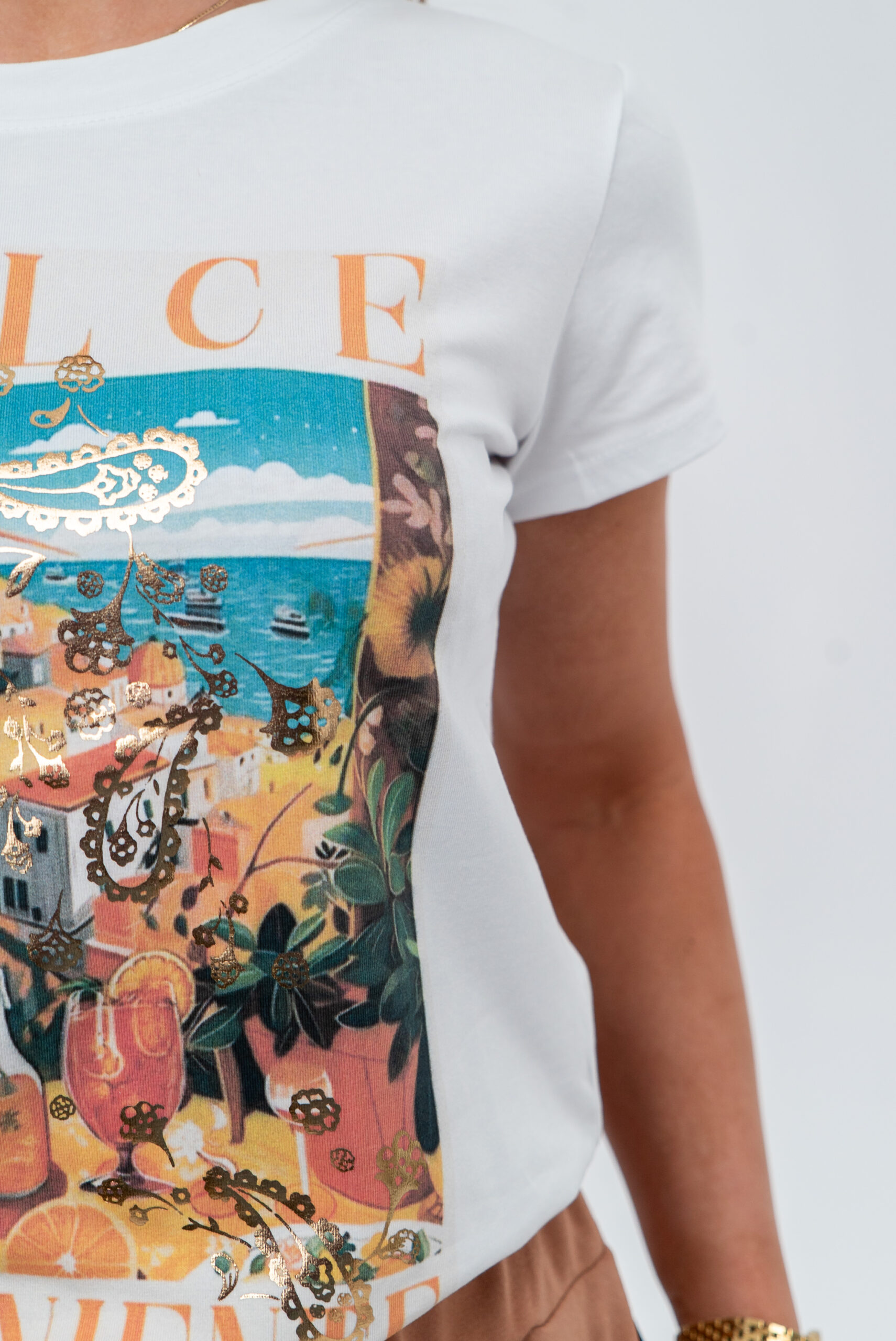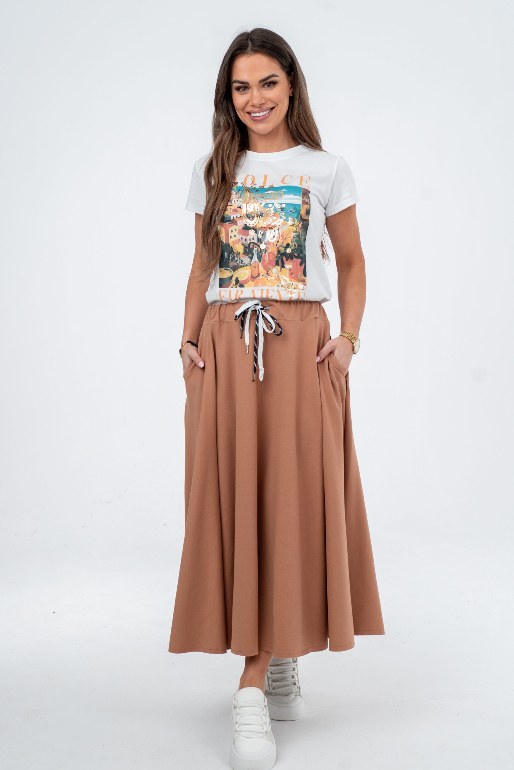 T-shirt z ozdobnym nadrukiem. Bluzka najbardziej przypadnie do gustu fankom luźnych, sportowych stylizacji. Została wykonana z wysokogatunkowego, miłego w dotyku materiału, który szybko się nie zniszczy. T-shirt damski będzie się znakomicie prezentować razem z jeansami i kataną ale także z klasyczną spódnicą. Dodaj pazura do swojej stylizacji!