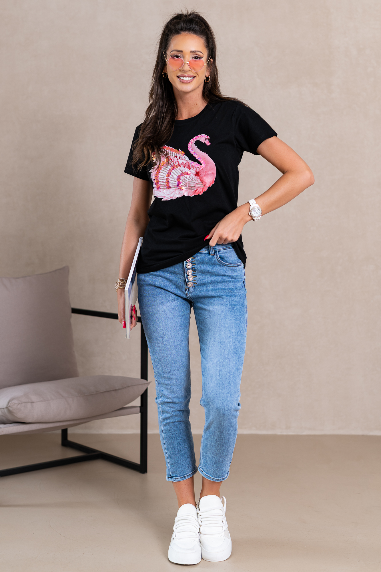 T-shirt z ozdobnym nadrukiem. Bluzka najbardziej przypadnie do gustu fankom luźnych, sportowych stylizacji. Została wykonana z wysokogatunkowego, miłego w dotyku materiału. Będzie się znakomicie prezentować razem z jeansami i kataną ale także z klasyczną spódnicą. Dodaj pazura do swojej stylizacji!