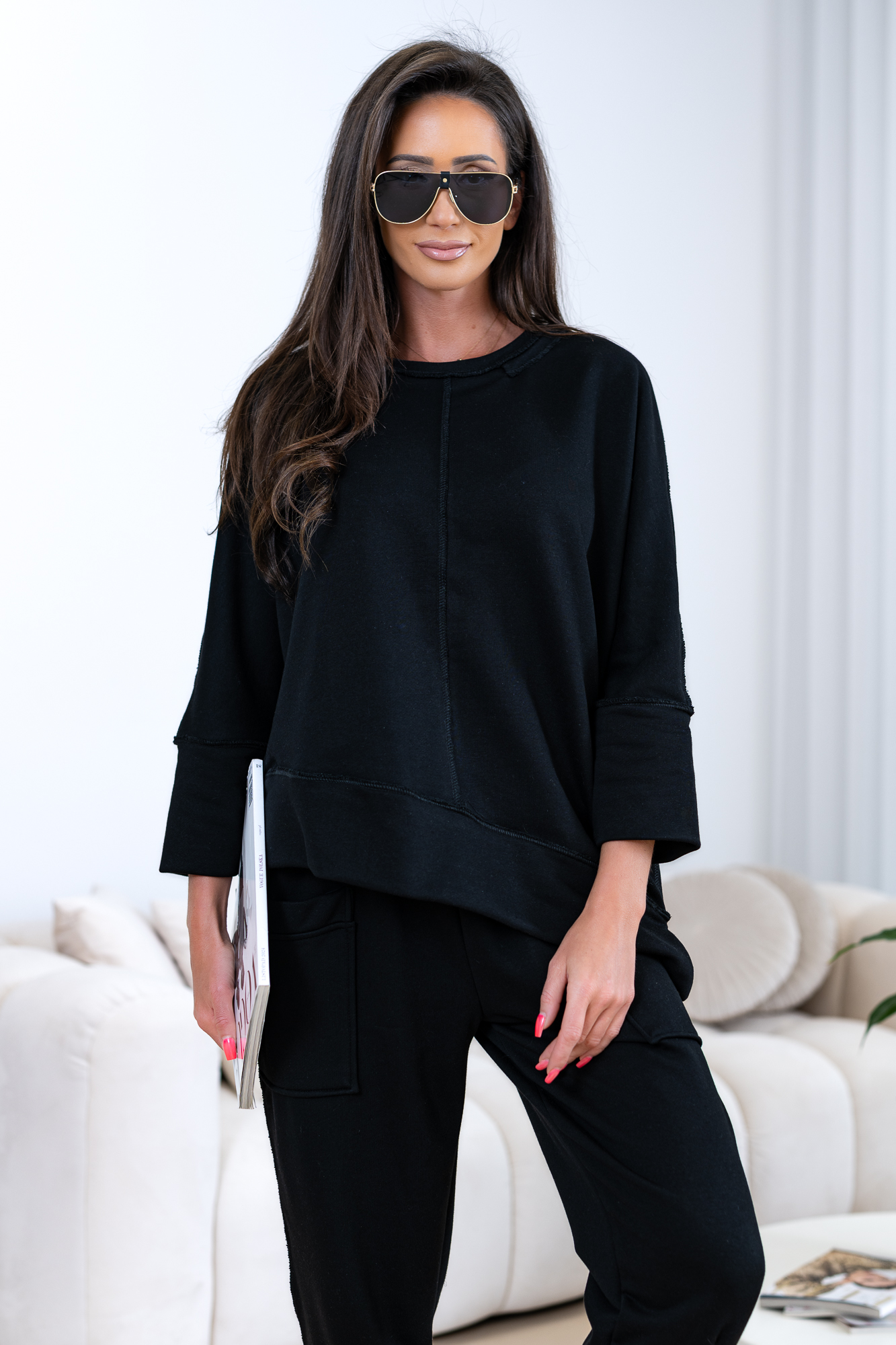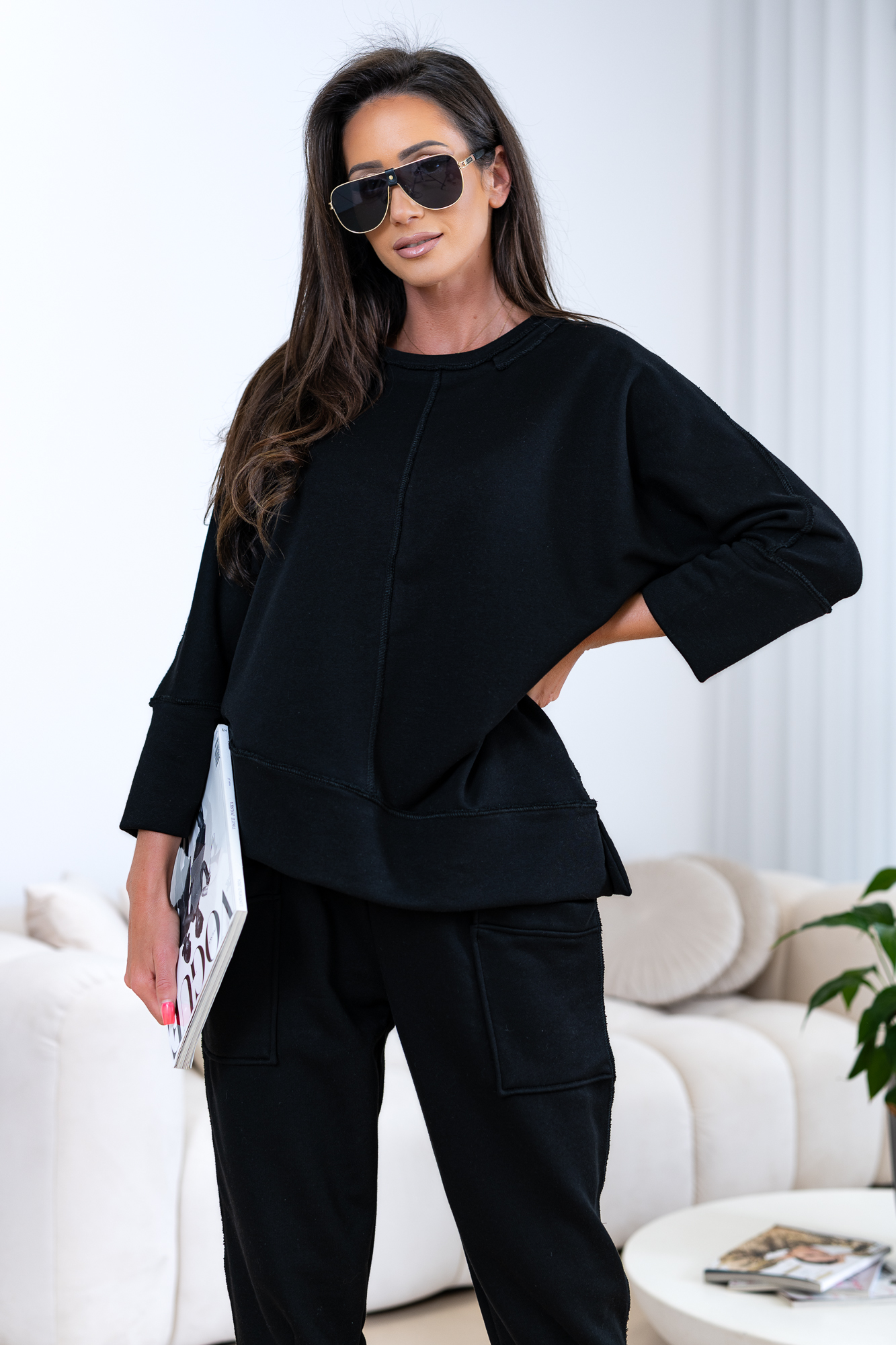 Viralowa bluza oversize uszyta z najwyższej jakości bawełnianej dzianiny, która jest wyjątkowo przyjemna w noszeniu.  Bluza posiada ciekawe przeszycia, które nadają jej wyjątkowego stylu. Materiał to wysokogatunkowa  bawełna – dzięki temu zestaw jest nie tylko miękki i przewiewny, ale także trwały, szybkoschnący i odporny na zmechacenia. Idealny zarówno na co dzień, jak i do stylizacji w duchu „sportowej elegancji”. Świetnie łączy się z masywnymi sneakersami, basicowymi T-shirtami czy eleganckimi dodatkami. To must-have w garderobie każdego, kto ceni wygodę i modny, luźny look