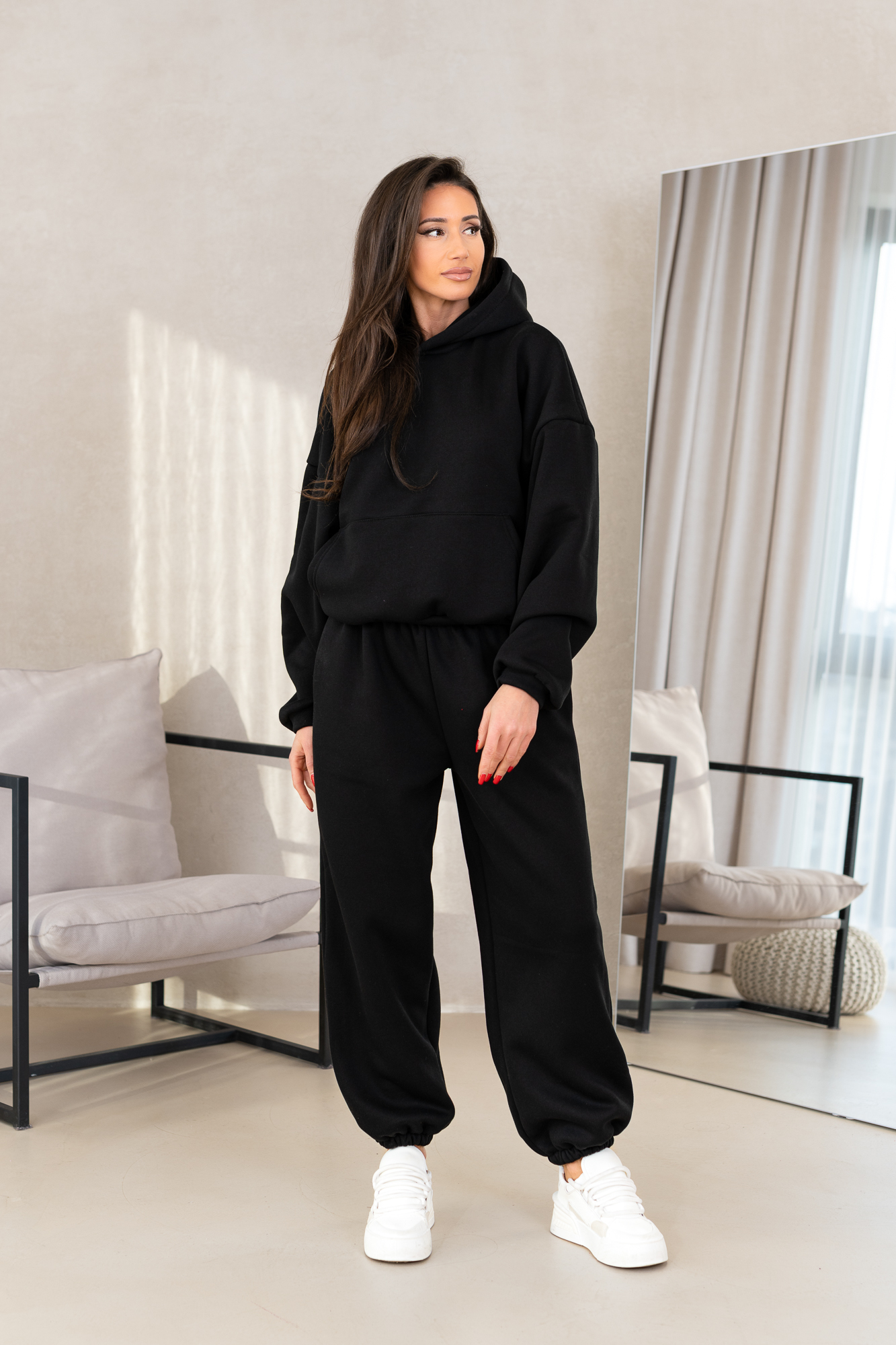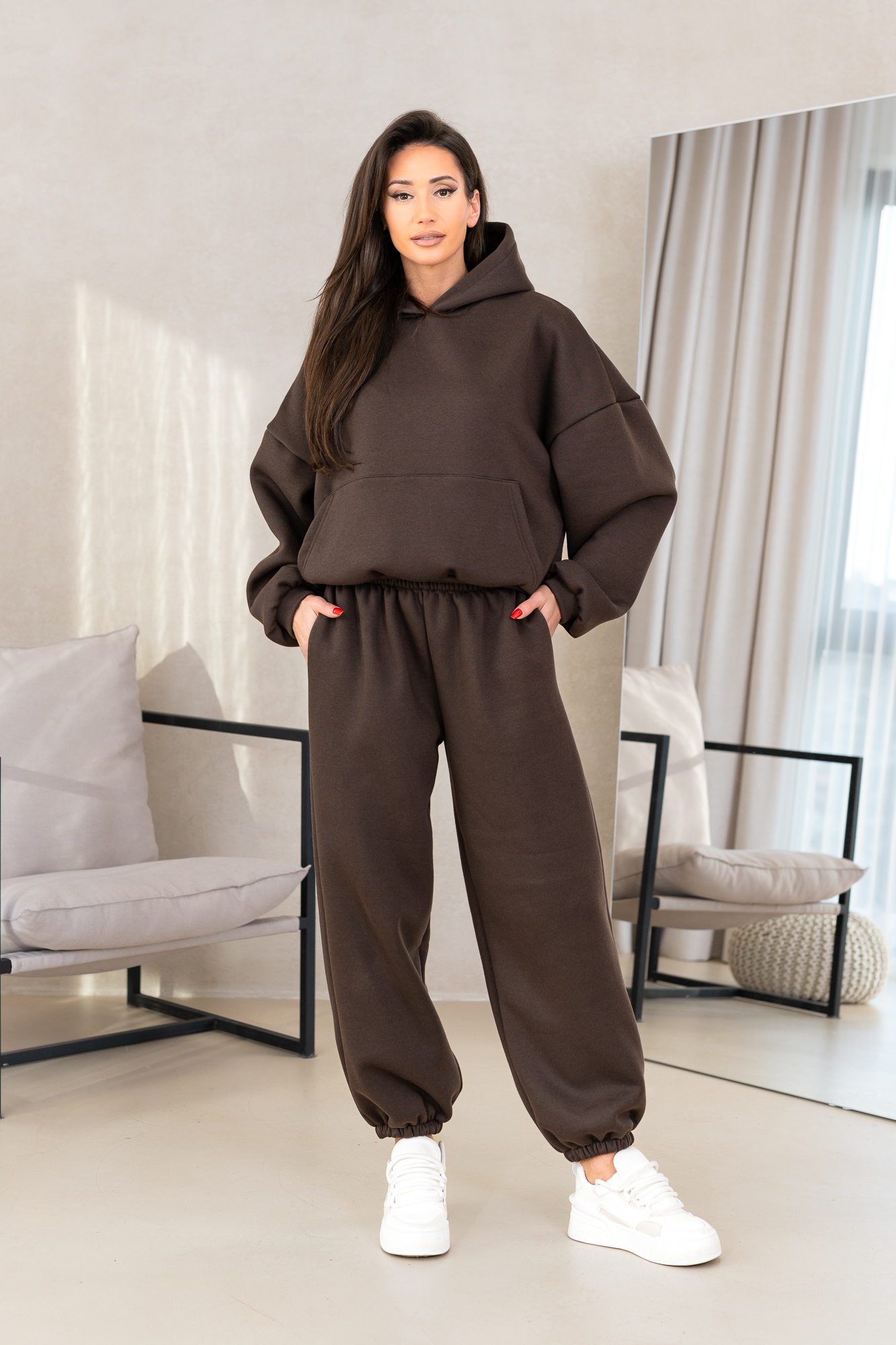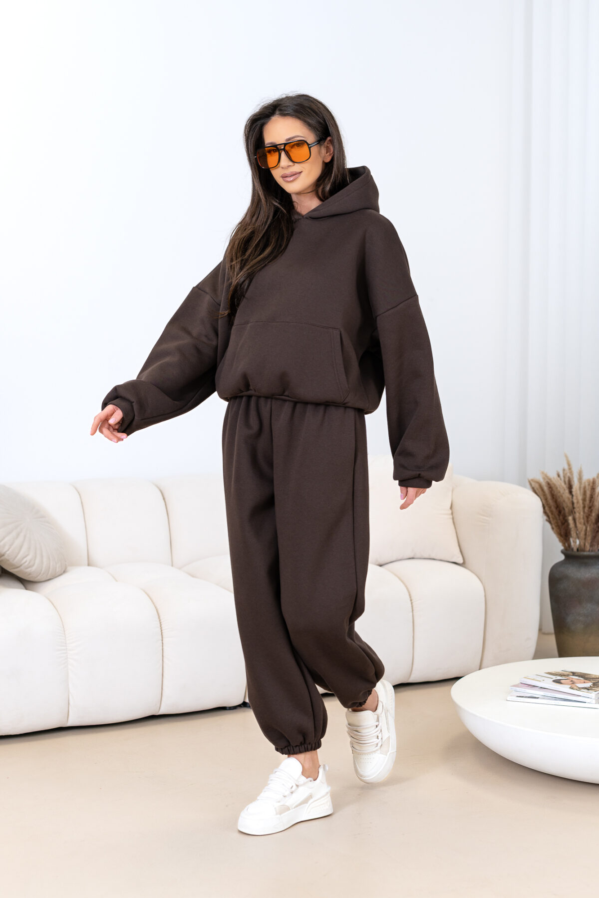 Kompletny zestaw uszyty z najwyższej jakości bawełnianej dzianiny dresowej drapanej od wewnątrz, która jest wyjątkowo przyjemna w noszeniu i otula ciepłem. W skład kompletu wchodzi nasza viralowa, oversize’owa bluza kangurka z kapturem oraz luźne spodnie baggy z gumką w pasie i na nogawkach.