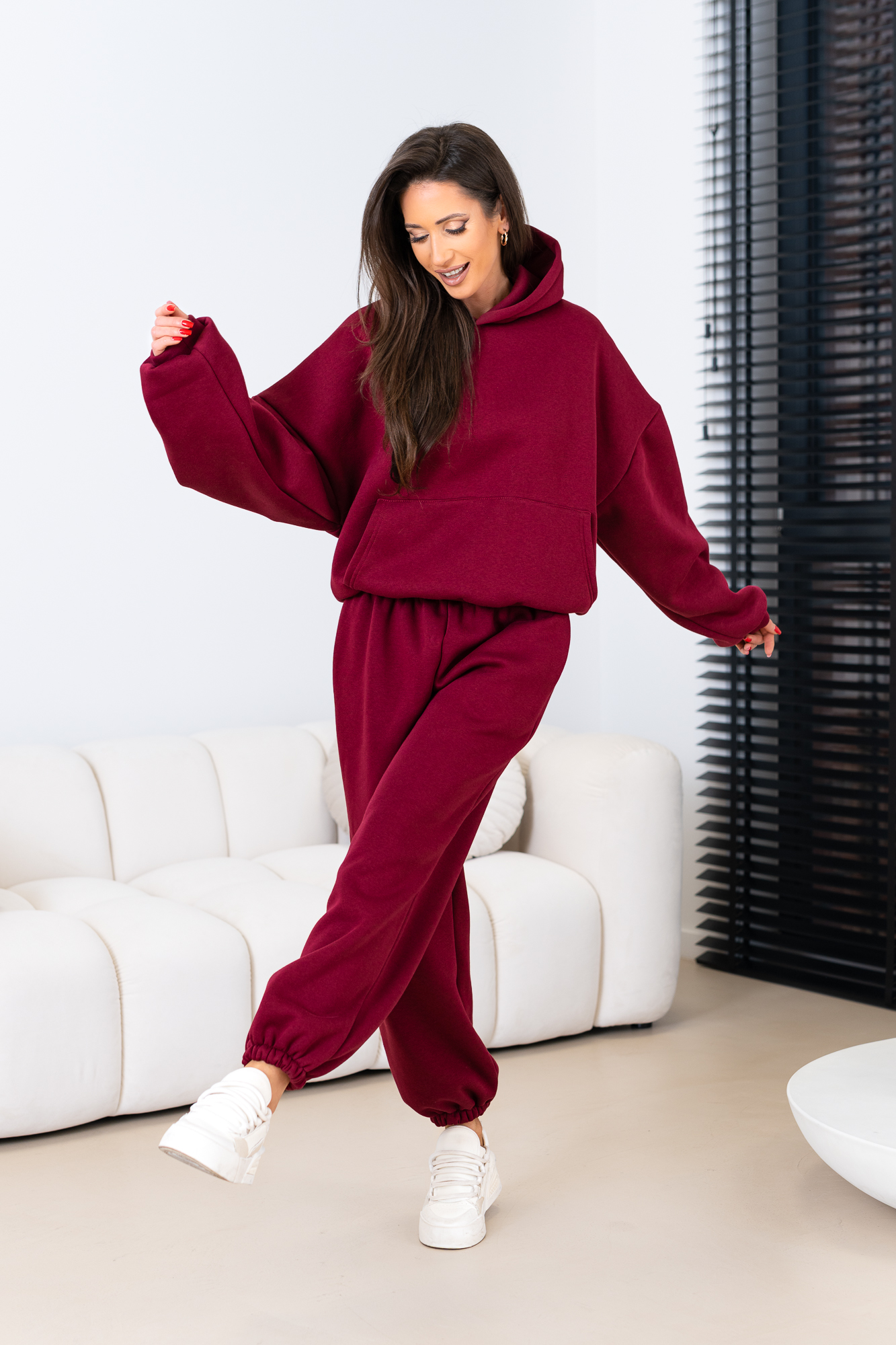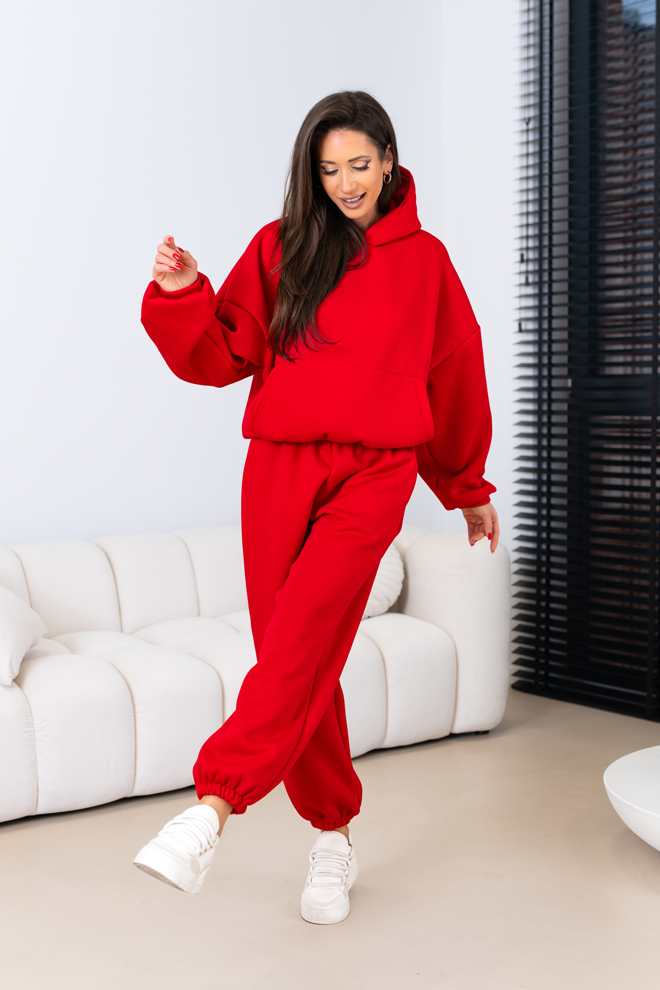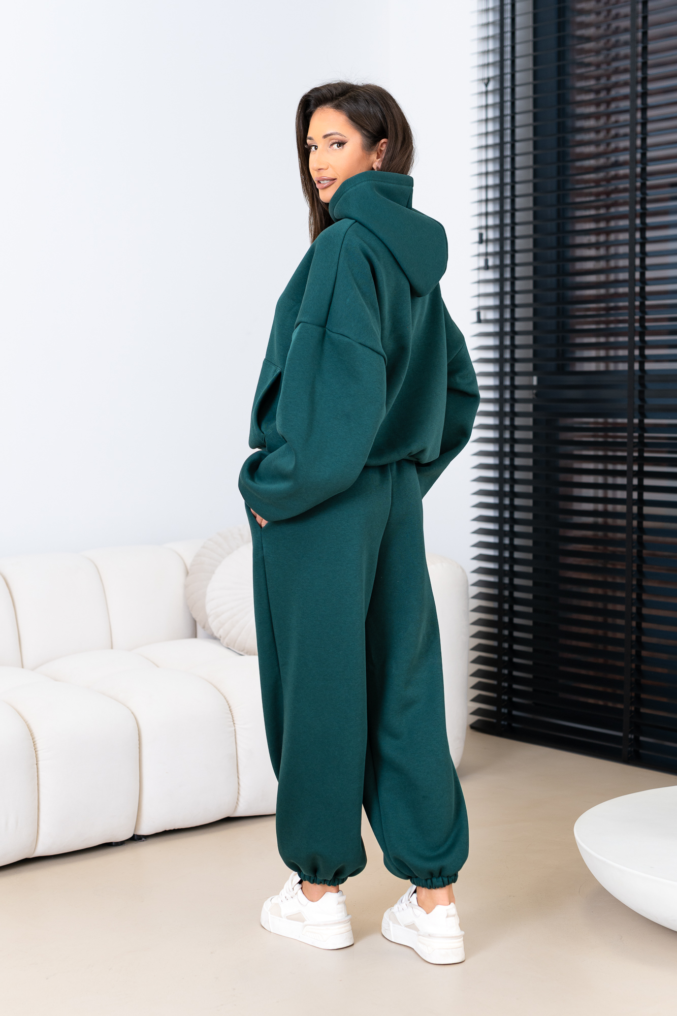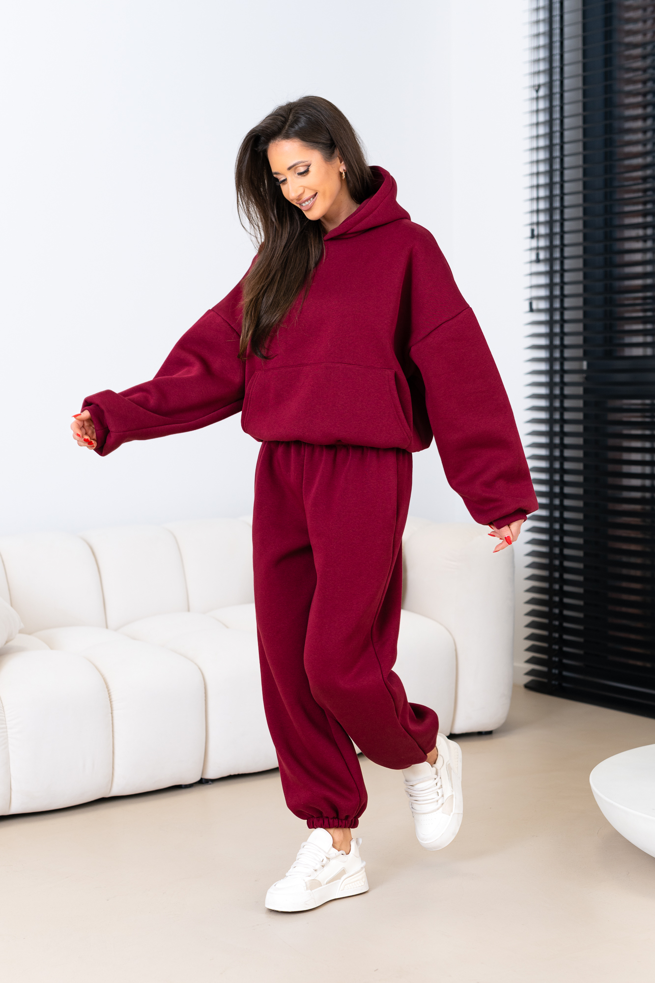 Kompletny zestaw uszyty z najwyższej jakości bawełnianej dzianiny dresowej drapanej od wewnątrz, która jest wyjątkowo przyjemna w noszeniu i otula ciepłem. W skład kompletu wchodzi nasza viralowa, oversize’owa bluza kangurka z kapturem oraz luźne spodnie baggy z gumką w pasie i na nogawkach.